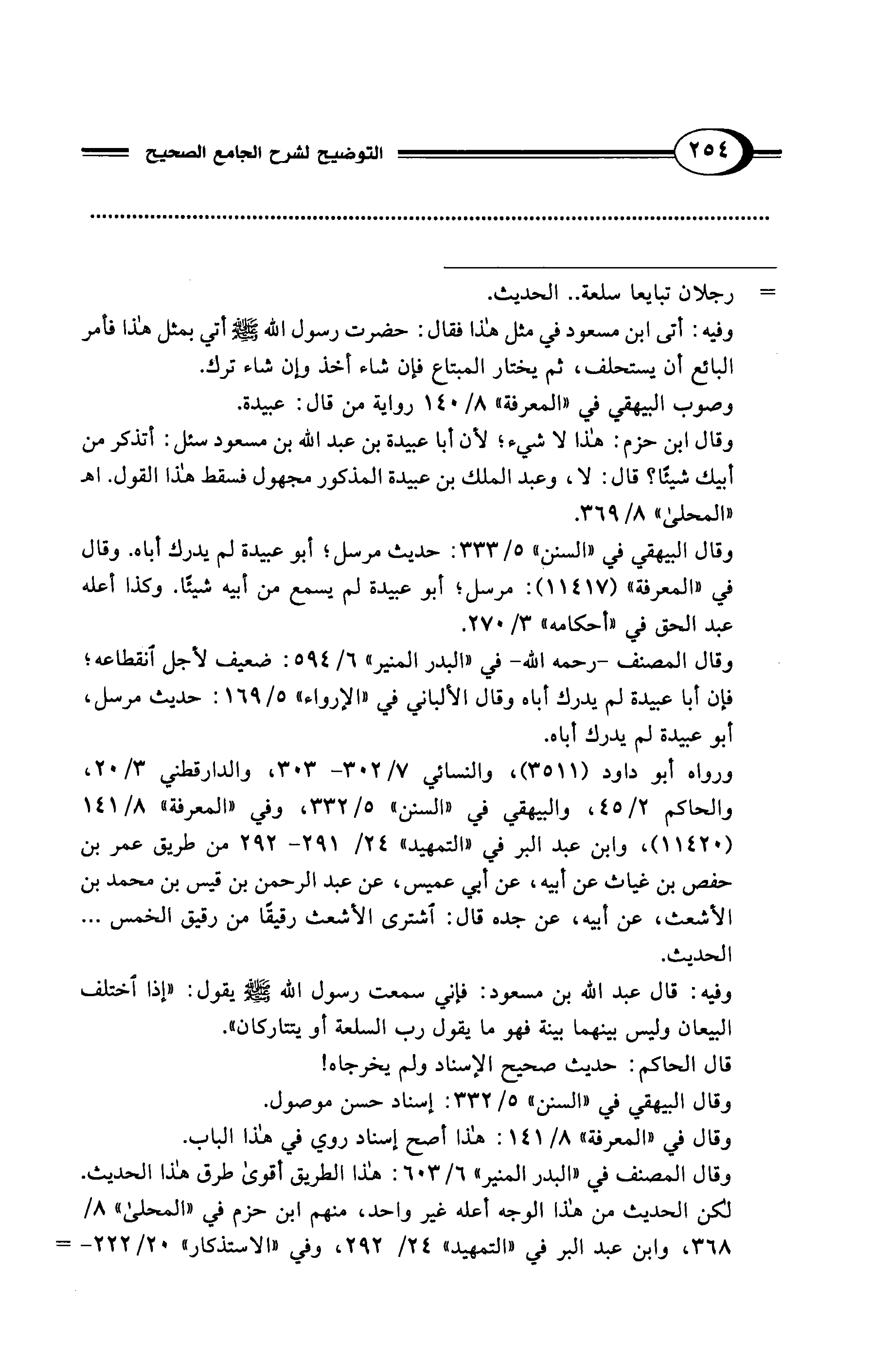 وفيه: أتى ابن مسعود في مثل هذا فقال: حضرت رسول الله - صلى الله عليه وسلم - أتي بمثل هذا فأمر البائع أن يستحلف، ثم يختار المبتاع فإن شاء أخذ وإن شاء ترك.