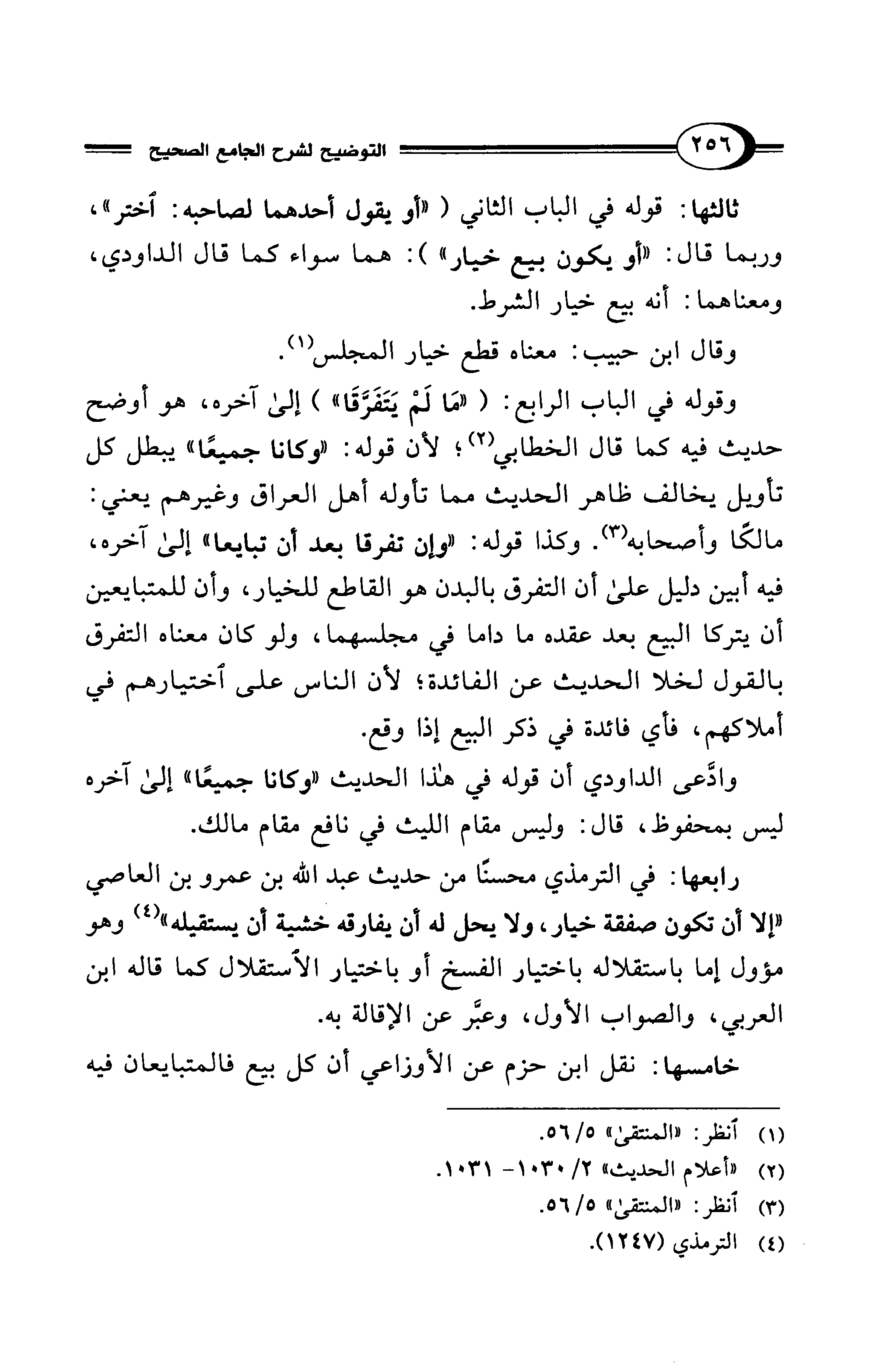 وقوله في الباب الرابع: ("مَا لَمْ يَتَفَرَّقَا") إلى آخره، هو أوضح حديث فيه كما قال الخطابي (¬2)؛ لأن قوله: "وكانا جميعًا" يبطل كل تأويل يخالف ظاهر الحديث مما تأوله أهل العراق وغيرهم يعني: مالكًا وأصحابه (¬3). وكذا قوله: "وإن تفرفا بعد أن تبايعا" إلى آخره، فيه أبين دليل على أن التفرق بالبدن هو القاطع للخيار، وأن للمتبايعين أن يتركا البيع بعد عقده ما داما في مجلسهما، ولو كان معناه التفرق بالقول لخلا الحديث عن الفائدة؛ لأن الناس على اختيارهم في أملاكهم، فأي فائدة في ذكر البيع إذا وقع.
