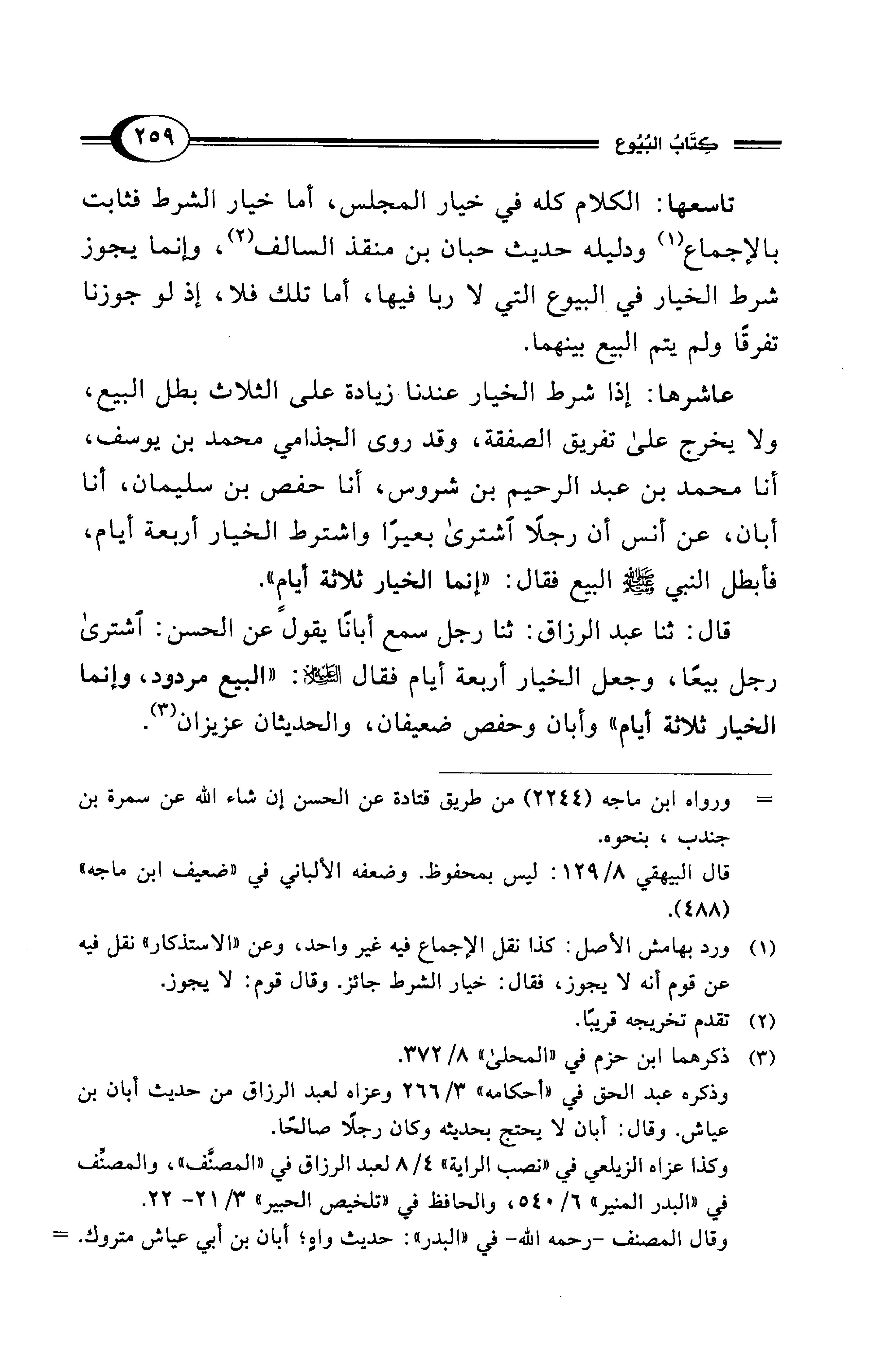 تاسعها: الكلام كله في خيار المجلس، أما خيار الشرط فثابت بالإجماع (¬1) ودليله حديث حبان بن منقذ السالف (¬2)، وإنما يجوز شرط الخيار في البيوع التي لا ربا فيها، أما تلك فلا، إذ لو جوزنا تفرقًا ولم يتم البيع بينهما.