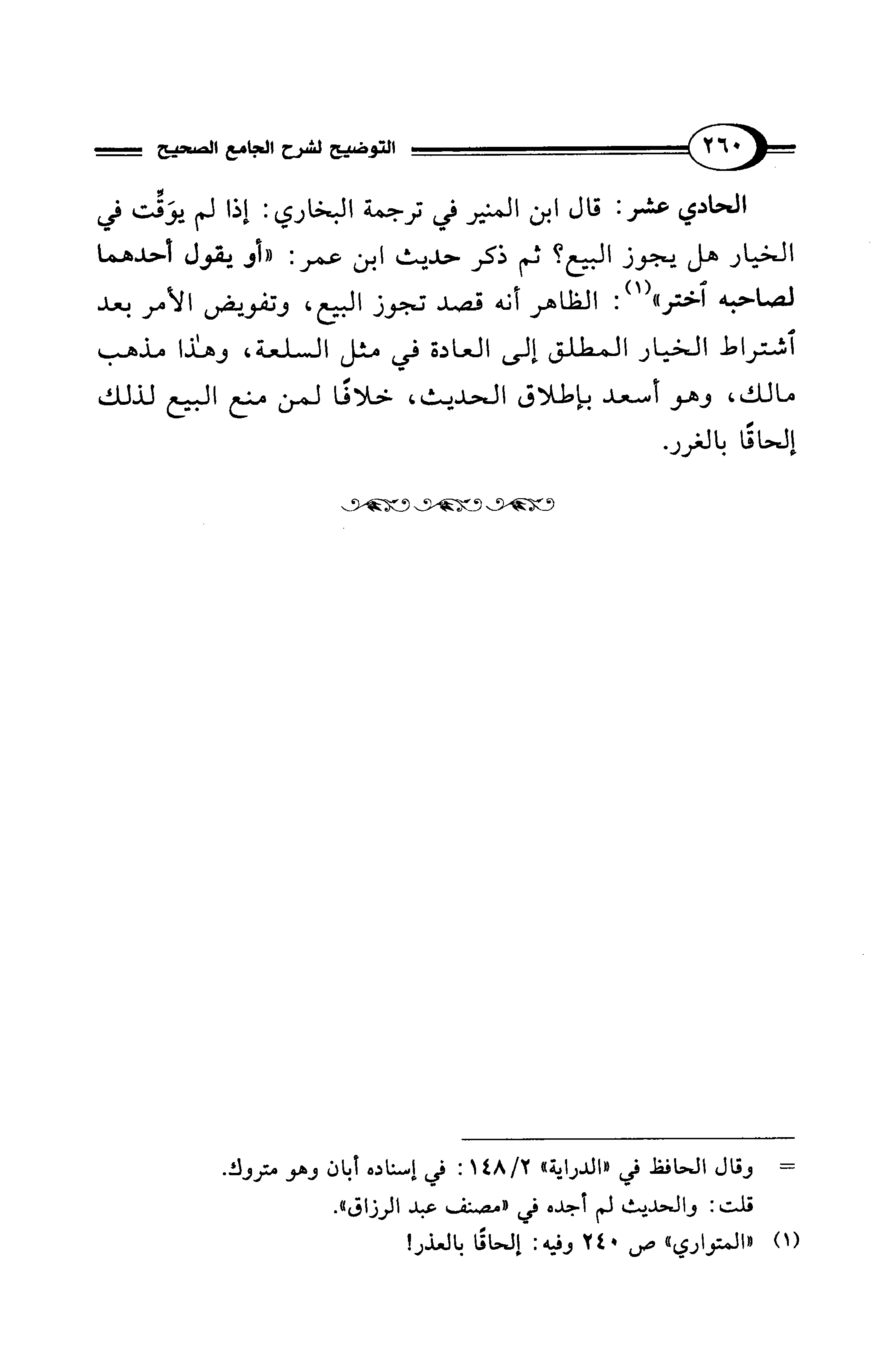 الحادي عشر: قال ابن المنير في ترجمة البخاري: إذا لم يوَقِّت في الخيار هل يجوز البيع؟ ثم ذكر حديث ابن عمر: "أو يقول أحدهما لصاحبه اختر" (¬1): الظاهر أنه قصد تجوز البيع، وتفويض الأمر بعد اشتراط الخيار المطلق إلى العادة في مثل السلعة، وهذا مذهب مالك، وهو أسعد بإطلاق الحديث، خلافًا لمن منع البيع لذلك إلحاقًا بالغرر.
