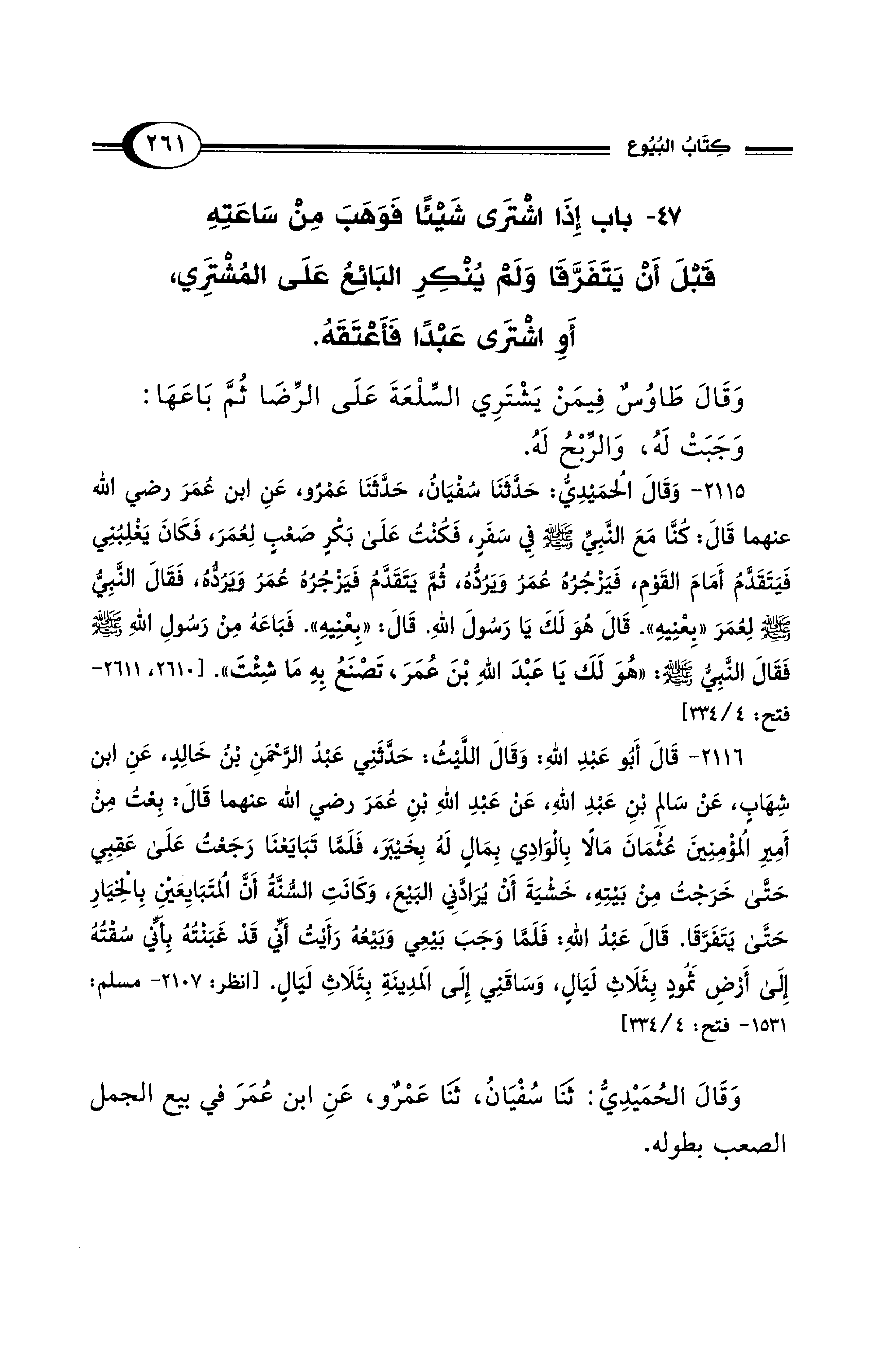 2116 - قَالَ أَبُو عَبْدِ اللهِ: وَقَالَ اللَّيْثُ: حَدَّثَنِي عَبْدُ الرَّحْمَنِ بْنُ خَالِدٍ، عَنِ ابْنِ شِهَابٍ، عَنْ سَالِمِ بْنِ عَبْدِ اللهِ، عَنْ عَبْدِ اللهِ بْنِ عُمَرَ رضي الله عنهما قَالَ: بِعْتُ مِنْ أَمِيرِ المُؤْمِنِينَ عُثْمَانَ مَالًا بِالوَادِي بِمَالٍ لَهُ بِخَيْبَرَ، فَلَمَّا تَبَايَعْنَا رَجَعْتُ عَلَى عَقِبِي حَتَّى خَرَجْتُ مِنْ بَيْتِهِ، خَشْيَةَ أَنْ يُرَادَّنِي البَيْعَ، وَكَانَتِ السُّنَّةُ أَنَّ المُتَبَايِعَيْنِ بِالخِيَارِ حَتَّى يَتَفَرَّقَا. قَالَ عَبْدُ اللهِ: فَلَمَّا وَجَبَ بَيْعِي وَبَيْعُهُ رَأَيْتُ أَنِّي قَدْ غَبَنْتُهُ بِأَنِّي سُقْتُهُ إِلَى أَرْضِ ثَمُودٍ بِثَلاَثِ لَيَالٍ، وَسَاقَنِي إِلَى المَدِينَةِ بِثَلاَثِ لَيَالٍ. [انظر: 2107 - مسلم: 1531 - فتح: 4/ 334]