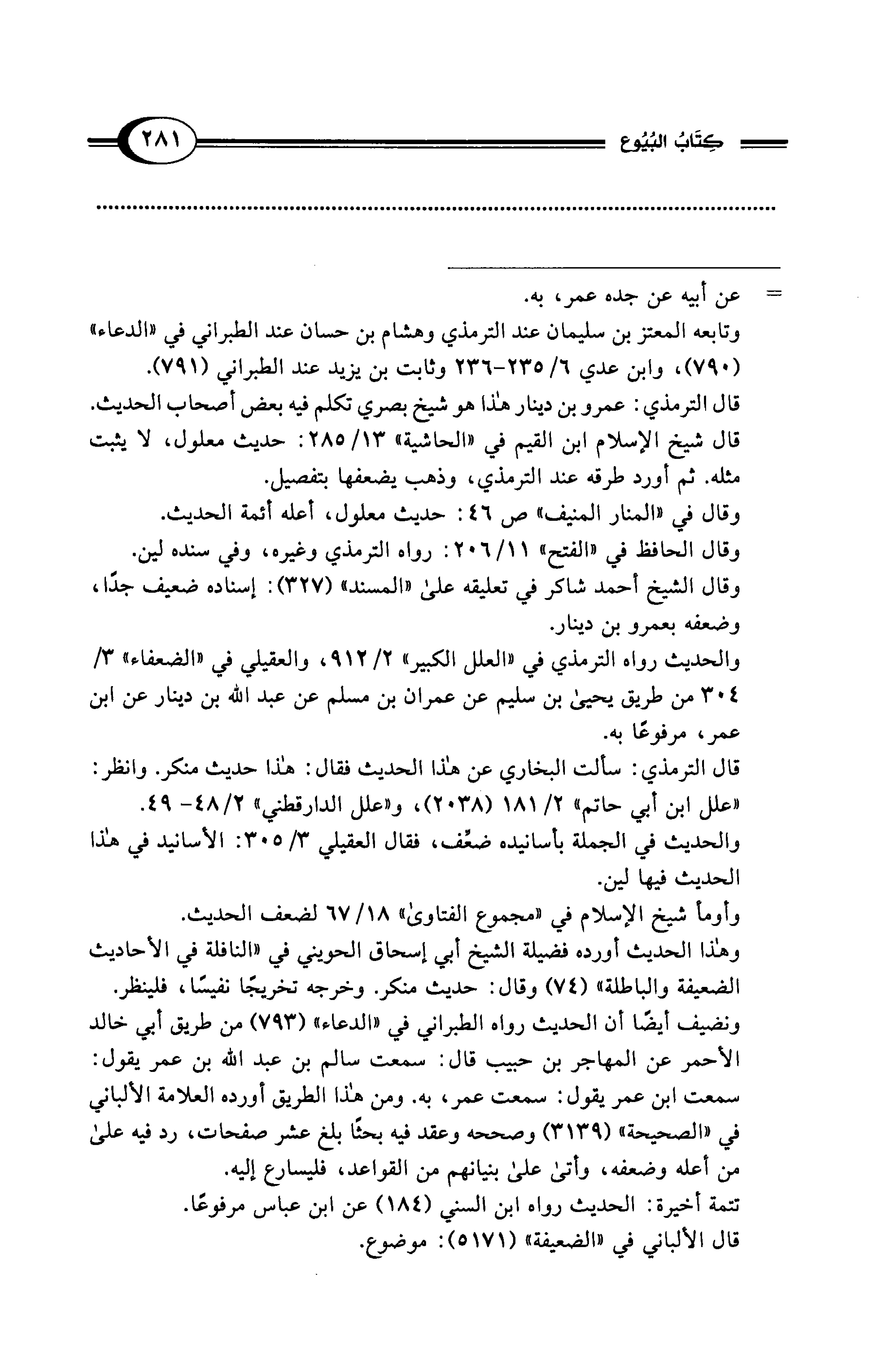 والحديث رواه الترمذي في "العلل الكبير" 2/ 912، والعقيلي في "الضعفاء" 3/ 304 من طريق يحيى بن سليم عن عمران بن مسلم عن عبد الله بن دينار عن ابن عمر، مرفوعًا به.