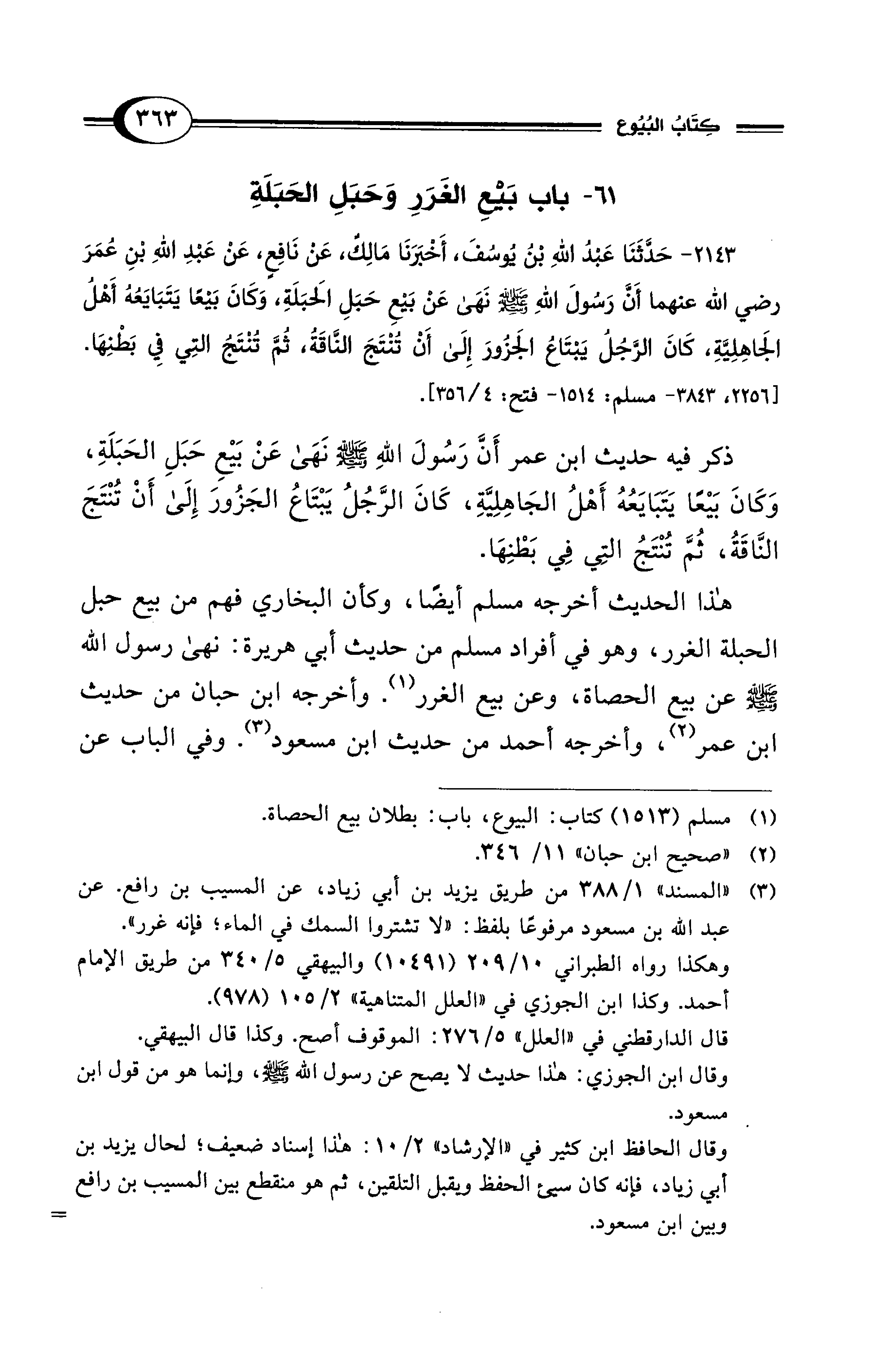 2143 - حَدَّثَنَا عَبْدُ اللهِ بْنُ يُوسُفَ، أَخْبَرَنَا مَالِكٌ، عَنْ نَافِعٍ، عَنْ عَبْدِ اللهِ بْنِ عُمَرَ رضي الله عنهما أَنَّ رَسُولَ اللهِ - صلى الله عليه وسلم - نَهَى عَنْ بَيْعِ حَبَلِ الحَبَلَةِ، وَكَانَ بَيْعًا يَتَبَايَعُهُ أَهْلُ الجَاهِلِيَّةِ، كَانَ الرَّجُلُ يَبْتَاعُ الجَزُورَ إِلَى أَنْ تُنْتَجَ النَّاقَةُ، ثُمَّ تُنْتَجُ الَّتِي فِي بَطْنِهَا. [2256، 3843 - مسلم: 1514 - فتح: 4/ 356].
