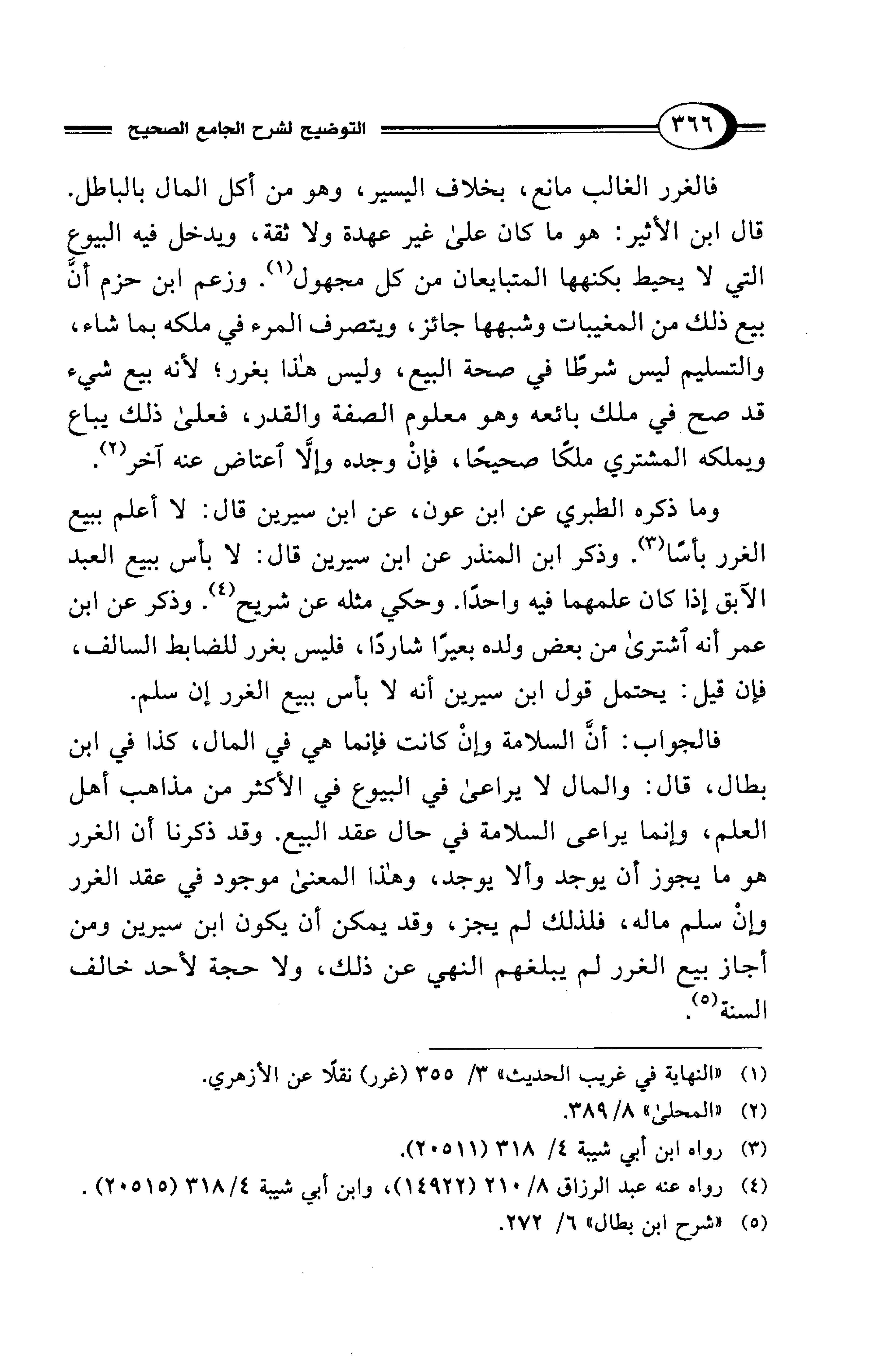 فالجواب: أنَّ السلامة وإنْ كانت فإنما هي في المال، كذا في ابن بطال، قال: والمال لا يراعى في البيوع في الأكثر من مذاهب أهل العلم، وإنما يراعى السلامة في حال عقد البيع. وقد ذكرنا أن الغرر هو ما يجوز أن يوجد وألا يوجد، وهذا المعنى موجود في عقد الغرر وإنْ سلم ماله، فلذلك لم يجز، وقد يمكن أن يكون ابن سيرين ومن أجاز بيع الغرر لم يبلغهم النهي عن ذلك، ولا حجة لأحد خالف السنة (¬5).