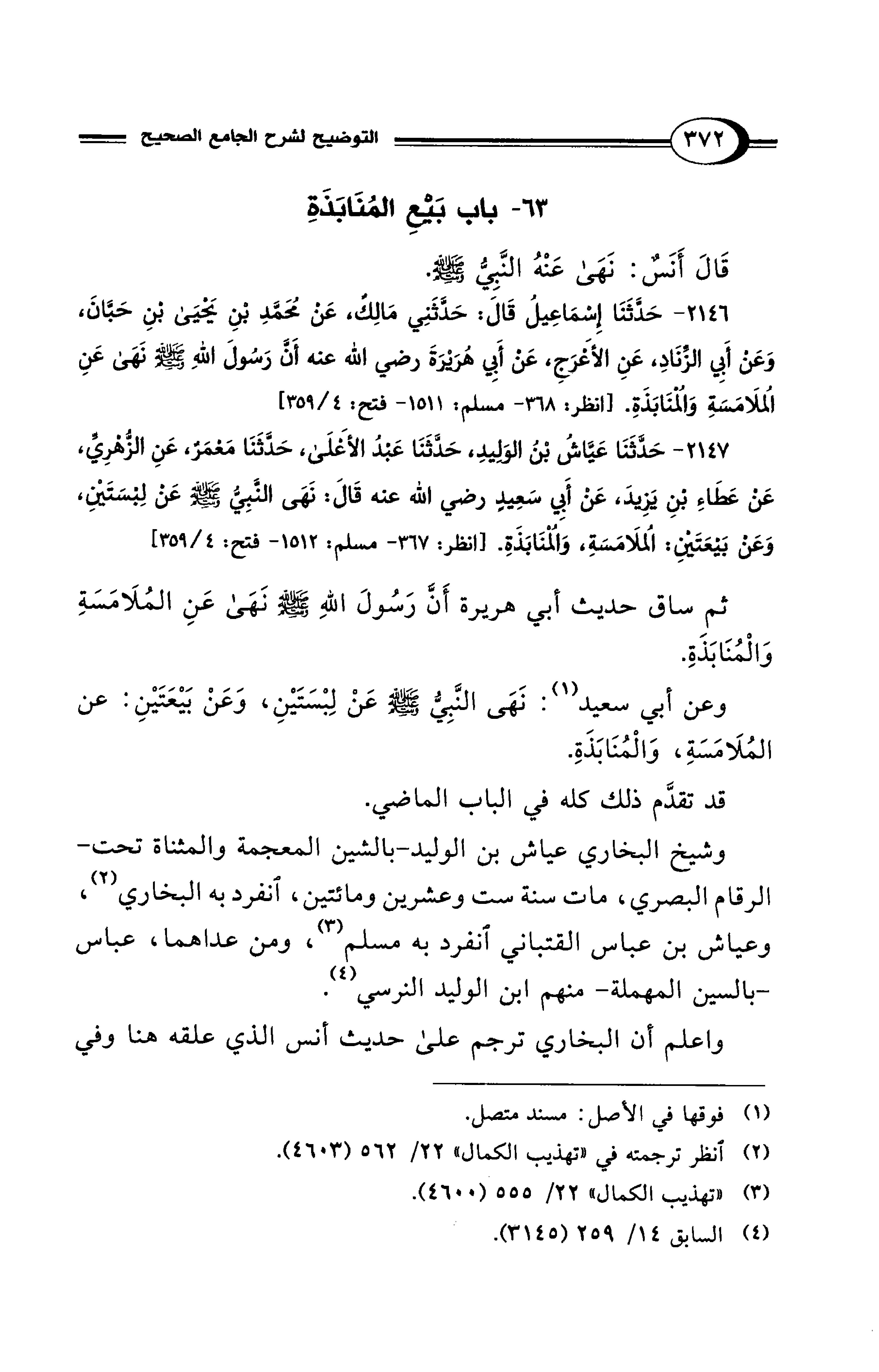ثمِ ساق حديث أبي هريرة أَنَّ رَسُولَ اللهِ - صلى الله عليه وسلم - نَهَى عَنِ المُلَامَسَةِ وَالمُنَابَذةِ.