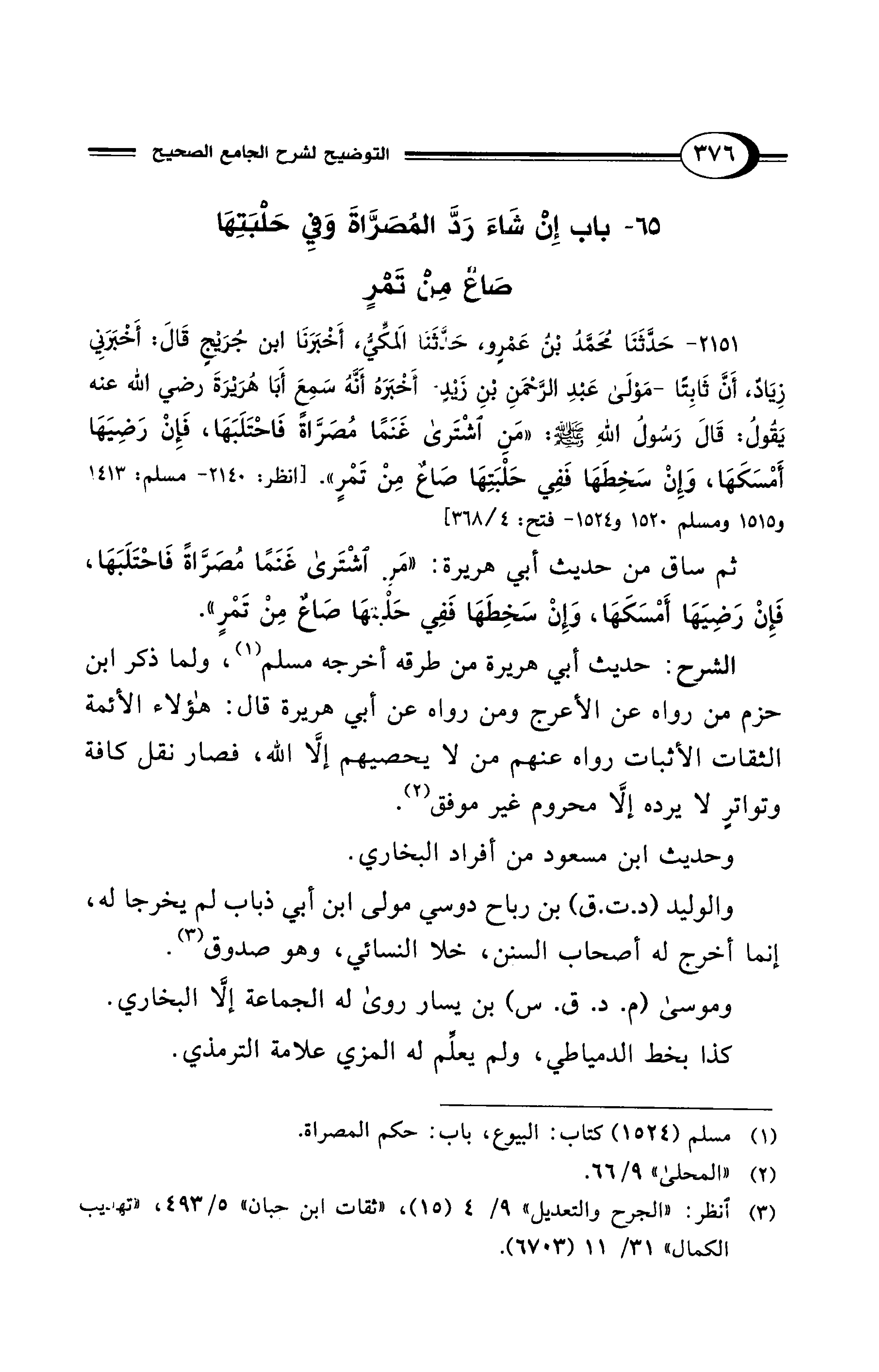 2151 - حَدَّثَنَا مُحَمَّدُ بْنُ عَمْرٍو، حَدَّثَنَا المَكِّيُّ، أَخْبَرَنَا ابْنُ جُرَيْجٍ قَالَ: أَخْبَرَنِي زِيَادٌ، أَنَّ ثَابِتًا -مَوْلَى عَبْدِ الرَّحْمَنِ بْنِ زَيْدٍ- أَخْبَرَهُ أَنَّهُ سَمِعَ أَبَا هُرَيْرَةَ رضي الله عنه يَقُولُ: قَالَ رَسُولُ اللهِ - صلى الله عليه وسلم -: "مَنِ اشْتَرَى غَنَمًا مُصَرَّاةً فَاحْتَلَبَهَا، فَإِنْ رَضِيَهَا أَمْسَكَهَا، وَإِنْ سَخِطَهَا فَفِي حَلْبَتِهَا صَاعٌ مِنْ تَمْرٍ". [انظر: 2140 - مسلم: 1413 و 1515 ومسلم 1520 و 1524 - فتح: 4/ 368]