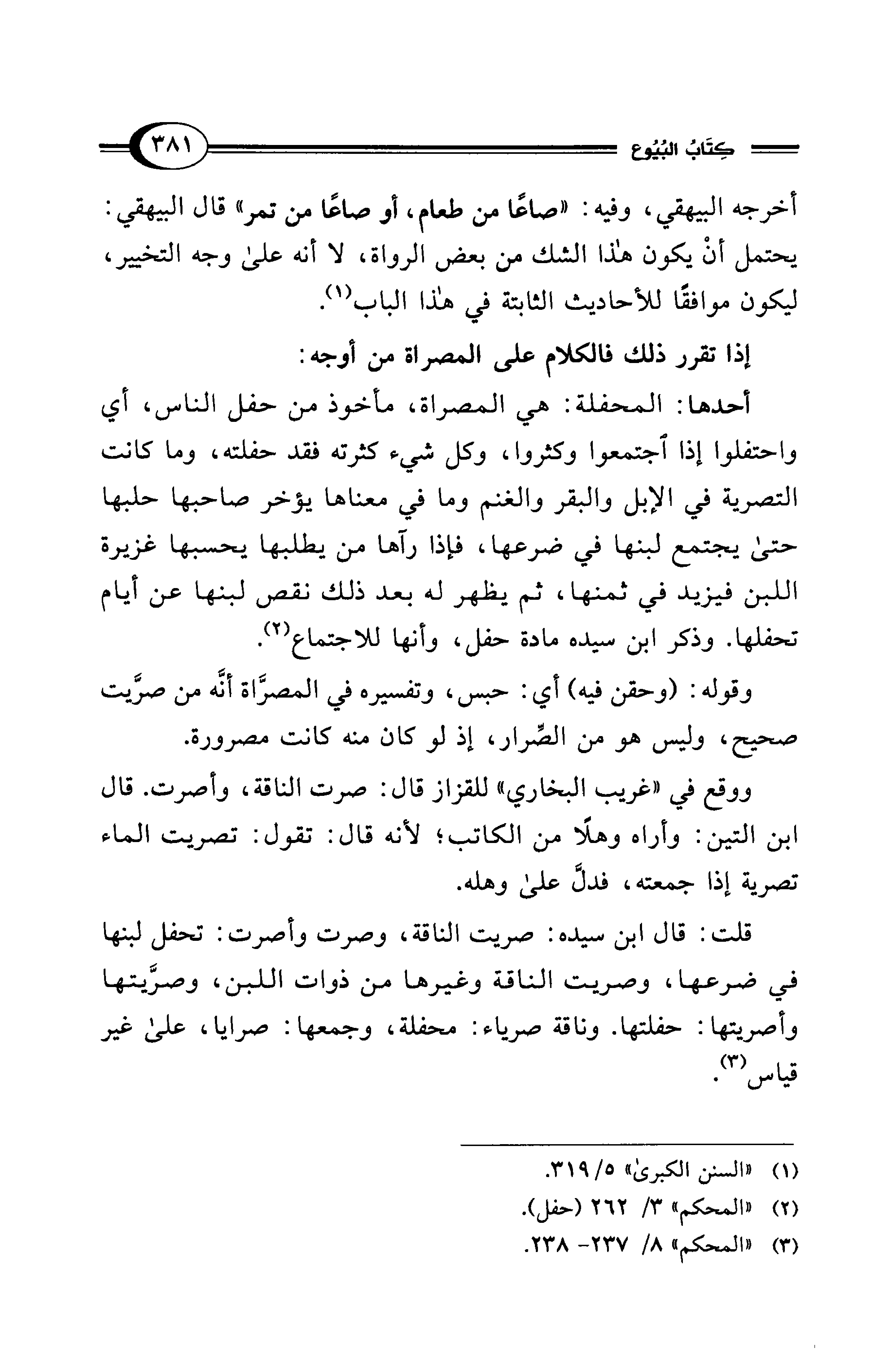 أحدها: المحفلة: هي المصراة، مأخوذ من حفل الناس، أي واحتفلوا إذا اجتمعوا وكثروا، وكل شيء كثرته فقد حفلته، وما كانت التصرية في الإبل والبقر والغنم وما في معناها يؤخر صاحبها حلبها