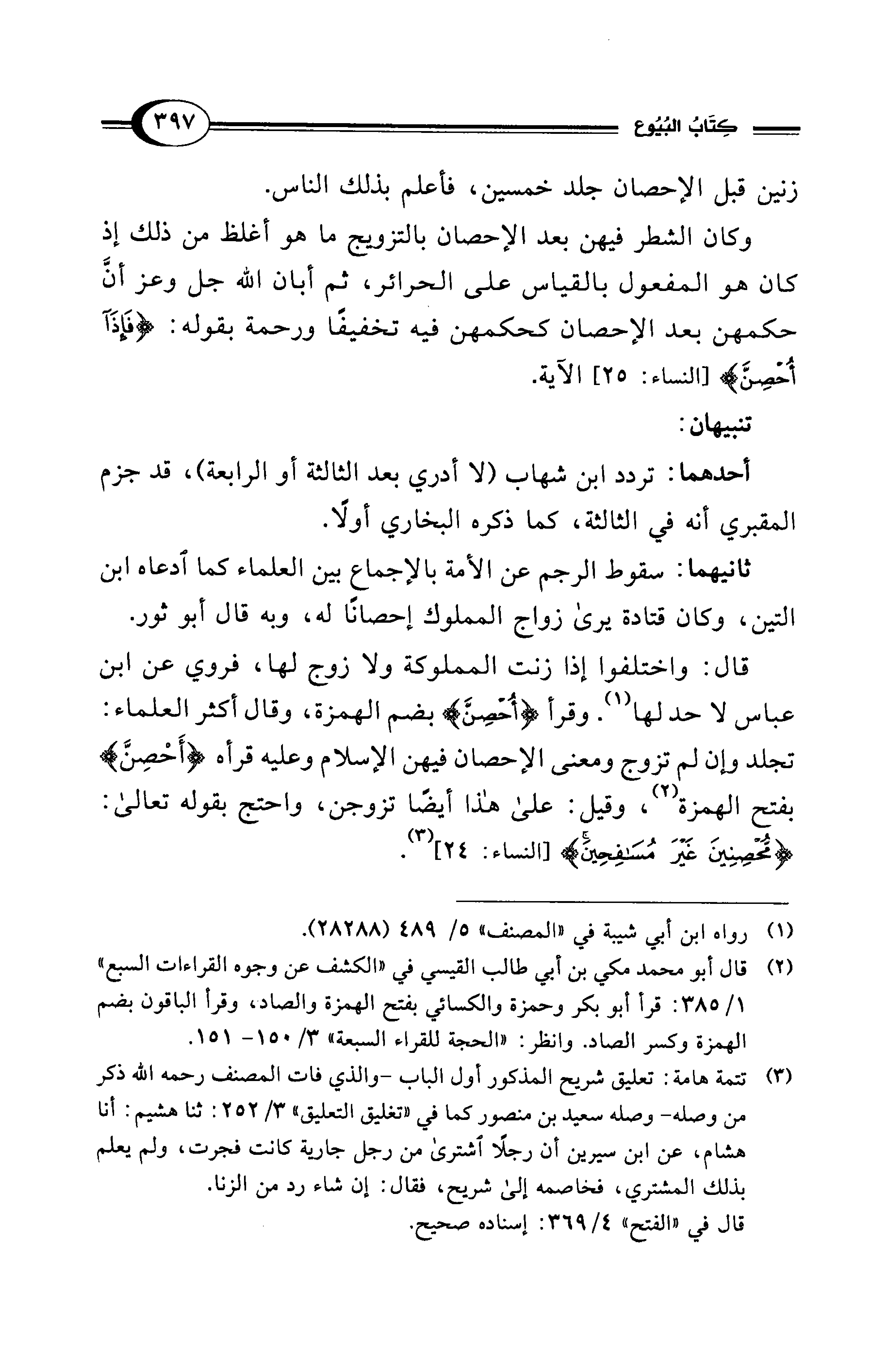 قال: واختلفوا إذا زنت المملوكة ولا زوج لها، فروي عن ابن عباس لا حد لها (¬1). وقرأى {أُحْصِنَّ} بضم الهمزة، وقال أكثر العلماء: تجلد وإن لم تزوج ومعنى الإحصان فيهن الإسلام وعليه قرأه {أَحْصِنَّ} بفتح الهمزة (¬2)، وقيل: على هذا أيضًا تزوجن، واحتج بقوله تعالى: {مُحْصِنِينَ غَيْرَ مُسَافِحِينَ} [النساء: 24] (¬3).