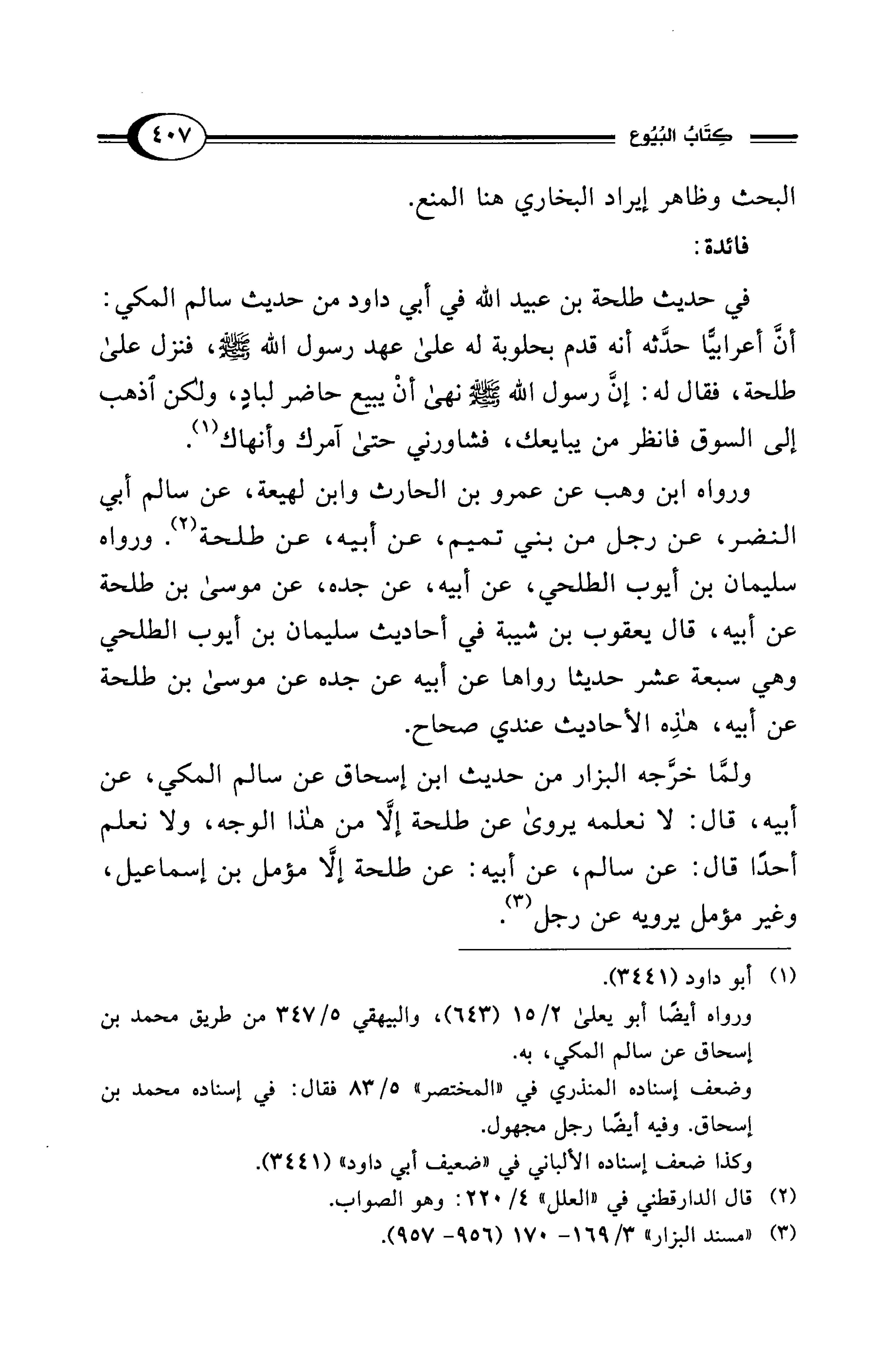 ولمَّا خرَّجه البزار من حديث ابن إسحاق عن سالم المكي، عن أبيه، قال: لا نعلمه يروى عن طلحة إلَّا من هذا الوجه، ولا نعلم أحدًا قال: عن سالم، عن أبيه: عن طلحة إلَّا مؤمل بن إسماعيل، وغير مؤمل يرويه عن رجل (¬3).