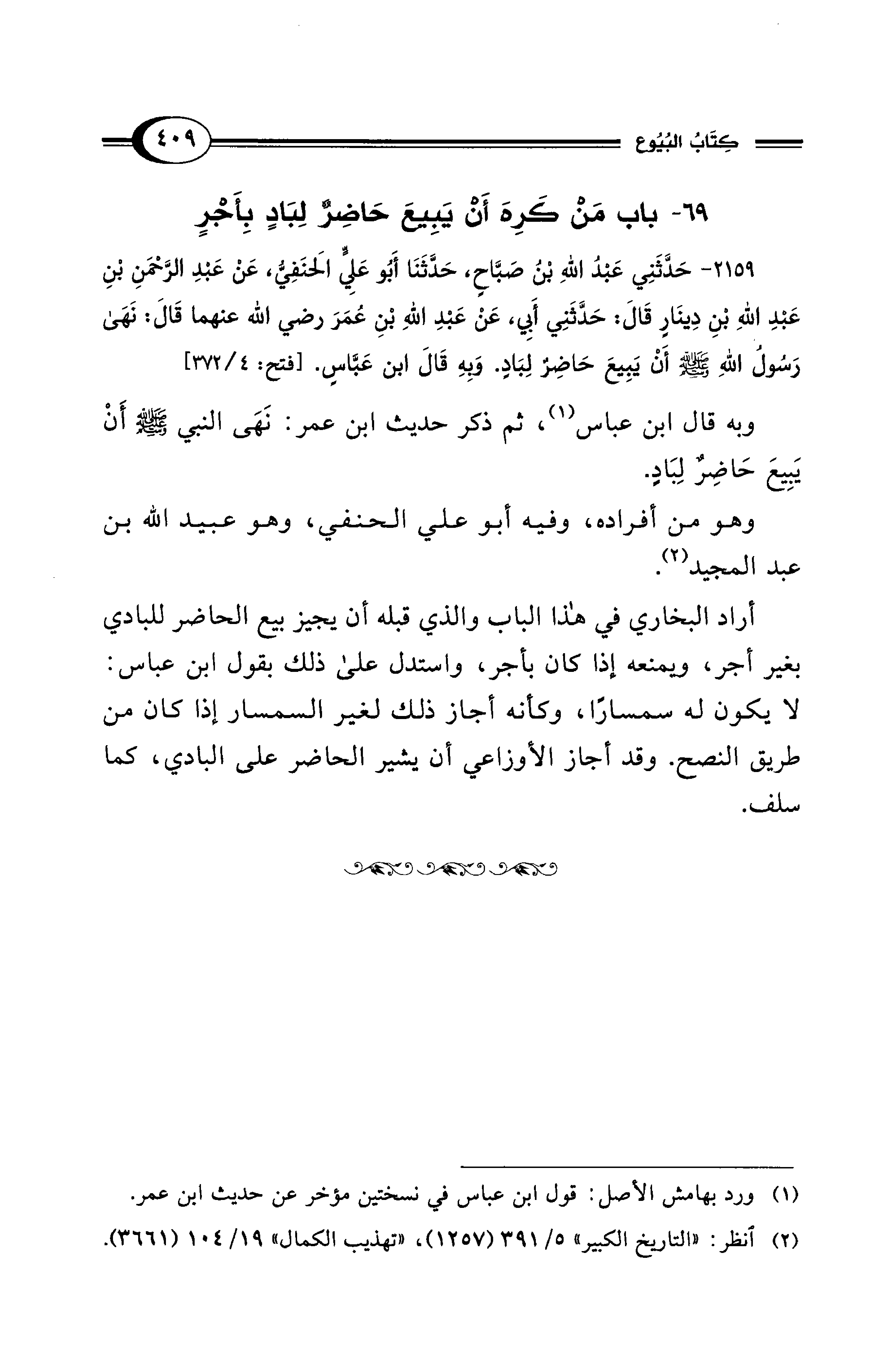 2159 - حَدَّثَنِي عَبْدُ اللهِ بْنُ صَبَّاحٍ، حَدَّثَنَا أَبُو عَلِيٍّ الحَنَفِيُّ، عَنْ عَبْدِ الرَّحْمَنِ بْنِ عَبْدِ اللهِ بْنِ دِينَارٍ قَالَ: حَدَّثَنِي أَبِي، عَنْ عَبْدِ اللهِ بْنِ عُمَرَ رضي الله عنهما قَالَ: نَهَى رَسُولُ اللهِ - صلى الله عليه وسلم - أَنْ يَبِيعَ حَاضِرٌ لِبَادٍ. وَبِهِ قَالَ ابْنُ عَبَّاسٍ. [فتح: 4/ 372]