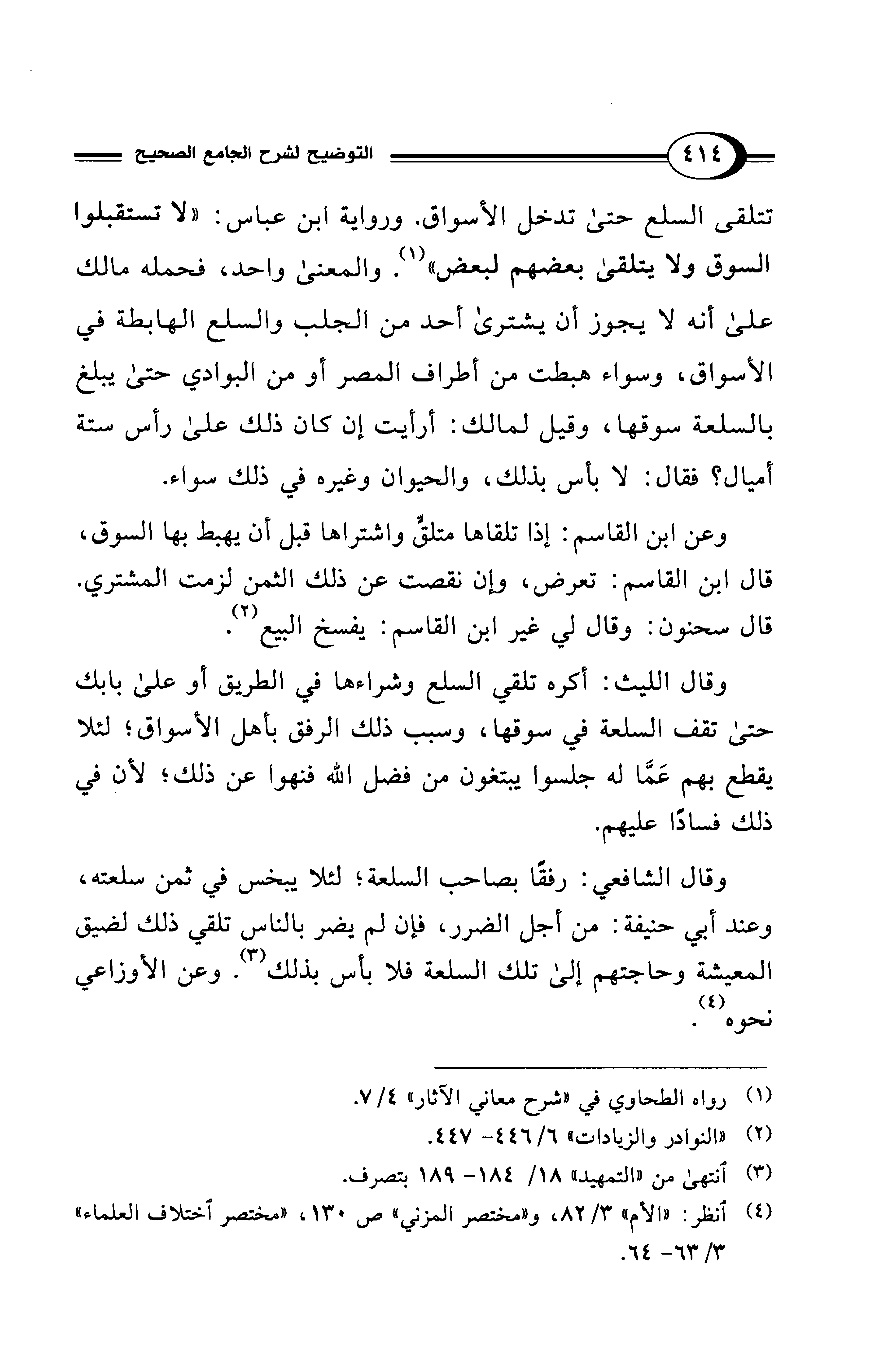 وعن ابن القاسم: إذا تلقاها متلقٍّ واشتراها قبل أن يهبط بها السوق، قال ابن القاسم: تعرض، وإن نقصت عن ذلك الثمن لزمت المشتري. قال سحنون: وقال لي غير ابن القاسم: يفسخ البيع (¬2).