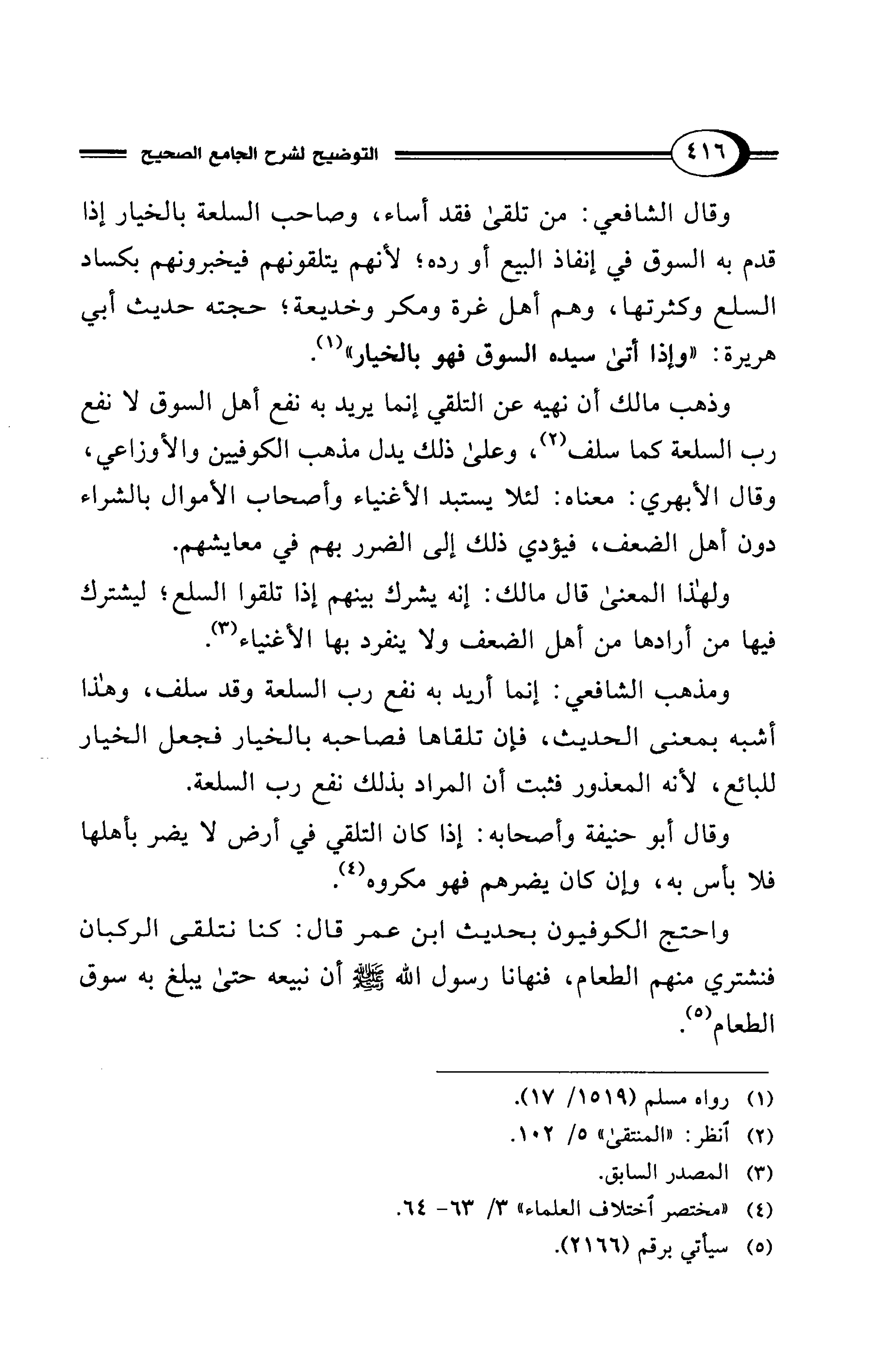 وذهب مالك أن نهيه عن التلقي إنما يريد به نفع أهل السوق لا نفع