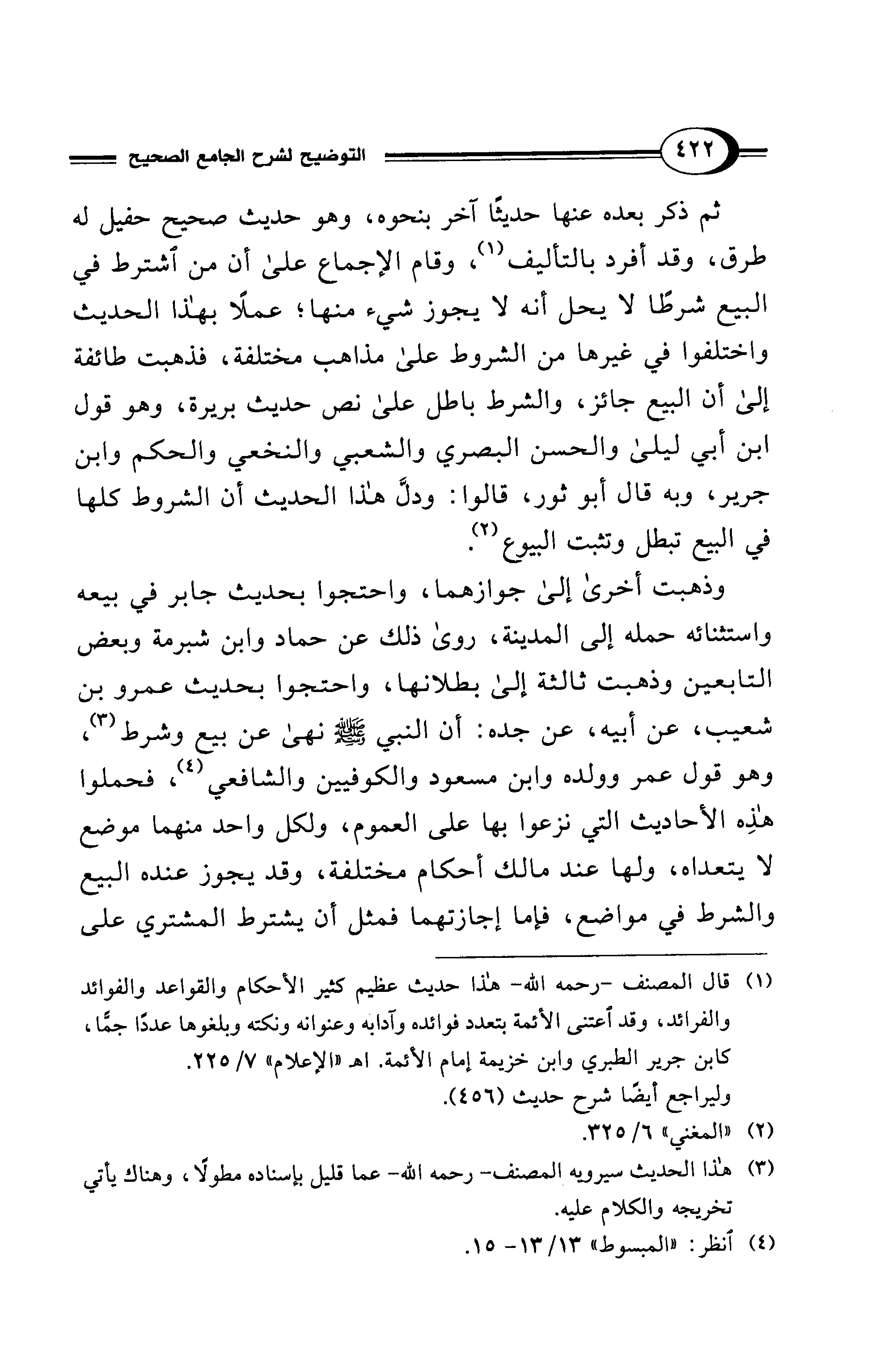 وذهبت أخرى إلى جوازهما، واحتجوا بحديث جابر في بيعه واستثنائه حمله إلى المدينة، روى ذلك عن حماد وابن شبرمة وبعض التابعين وذهبت ثالثة إلى بطلانها، واحتجوا بحديث عمرو بن شعيب، عن أبيه، عن جده: أن النبي - صلى الله عليه وسلم - نهى عن بيع وشرط (¬3)، وهو قول عمر وولده وابن مسعود والكوفيين والشافعي (¬4)، فحملوا هذِه الأحاديث التي نزعوا بها على العموم، ولكل واحد منهما موضع لا يتعداه، ولها عند مالك أحكام مختلفة، وقد يجوز عنده البيع والشرط في مواضع، فإما إجازتهما فمثل أن يشترط المشتري على