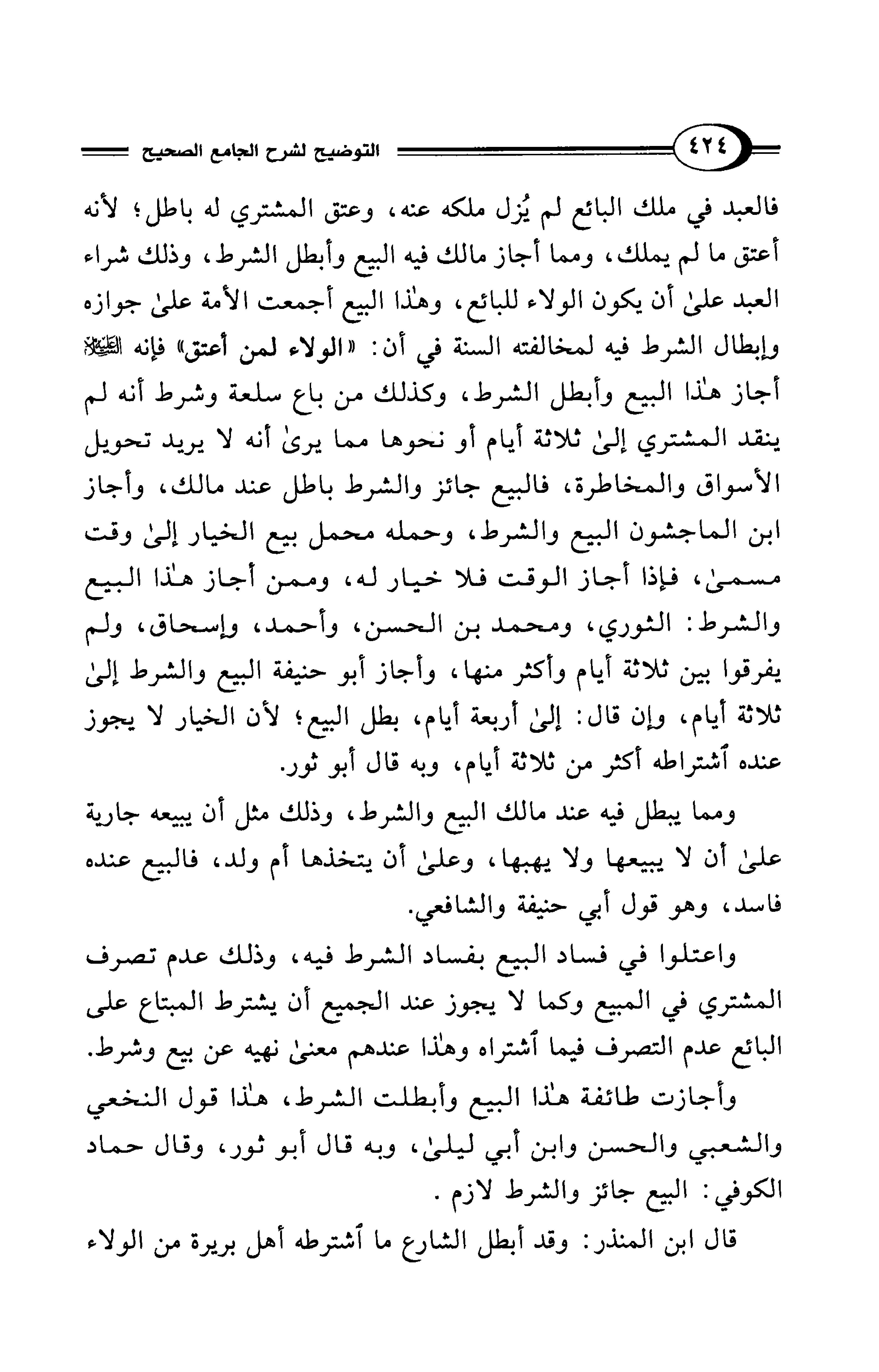 فالعبد في ملك البائع لم يُزل ملكه عنه، وعتق المشتري له باطل؛ لأنه أعتق ما لم يملك، ومما أجاز مالك فيه البيع وأبطل الشرط، وذلك شراء العبد على أن يكون الولاء للبائع، وهذا البيع أجمعت الأمة على جوازه وإبطال الشرط فيه لمخالفته السنة في أن: "الولاء لمن أعتق" فإنه - عليه السلام - أجاز هذا البيع وأبطل الشرط، وكذلك من باع سلعة وشرط أنه لم ينقد المشتري إلى ثلاثة أيام أو نحوها مما يرى أنه لا يريد تحويل الأسواق والمخاطرة، فالبيع جائز والشرط باطل عند مالك، وأجاز ابن الماجشون البيع والشرط، وحمله محمل بيع الخيار إلى وقت مسمى، فإذا أجاز الوقت فلا خيار له، وممن أجاز هذا البيع والشرط: الثوري، ومحمد بن الحسن، وأحمد، وإسحاق، ولم يفرقوا بين ثلاثة أيام وأكثر منها، وأجاز أبو حنيفة البيع والشرط إلى ثلاثة أيام، وإن قال: إلى أربعة أيام، بطل البيع؛ لأن الخيار لا يجوز