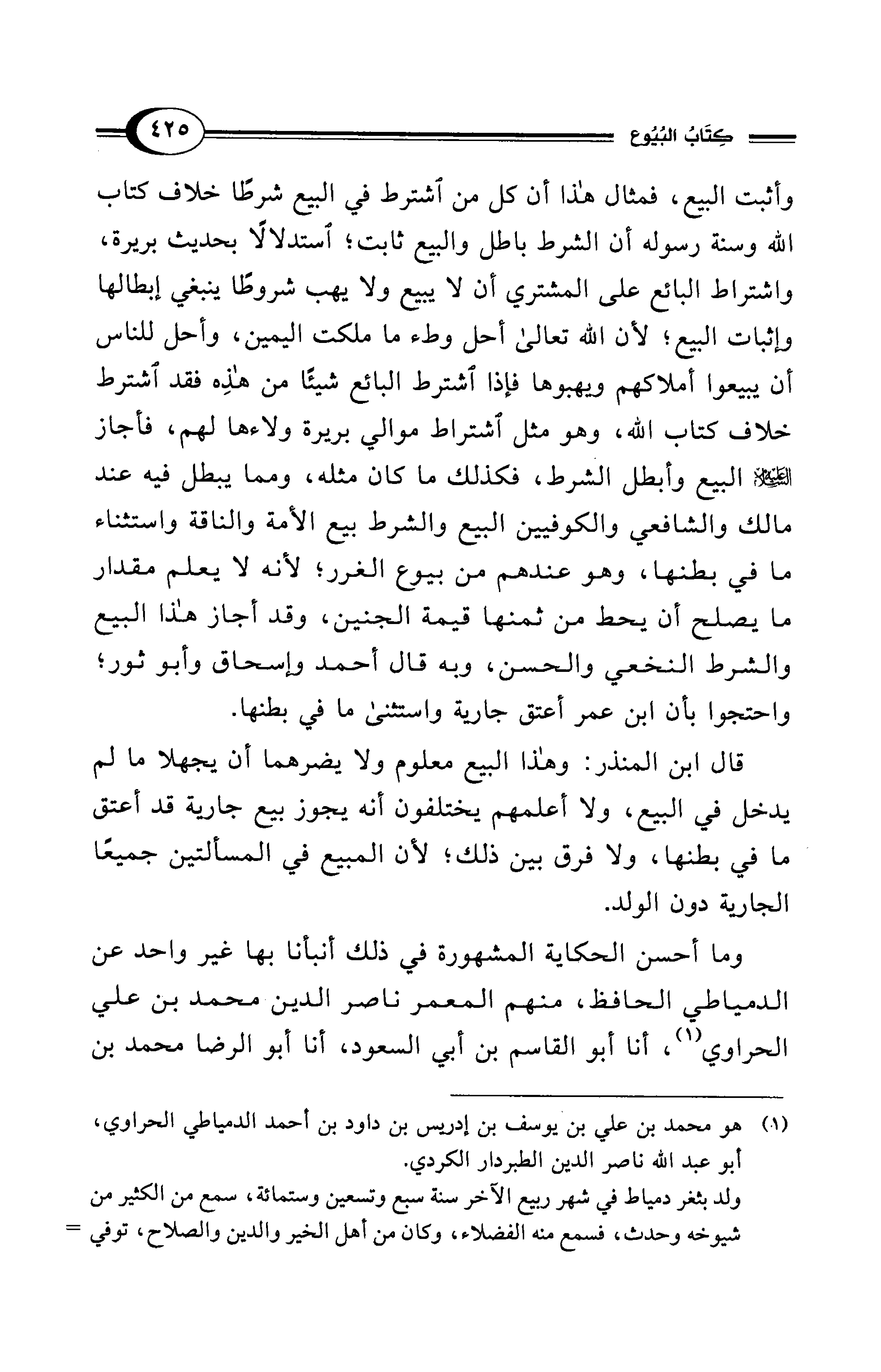 وأثبت البيع، فمثال هذا أن كل من اشترط في البيع شرطًا خلاف كتاب الله وسنة رسوله أن الشرط باطل والبيع ثابت؛ استدلالًا بحديث بريرة، واشتراط البائع على المشتري أن لا يبيع ولا يهب شروطًا ينبغي إبطالها وإثبات البيع؛ لأن الله تعالى أحل وطء ما ملكت اليمين، وأحل للناس أن يبيعوا أملاكهم ويهبوها فإذا اشترط البائع شيئًا من هذِه فقد اشترط خلاف كتاب الله، وهو مثل اشتراط موالي بريرة ولاءها لهم، فأجاز - عليه السلام - البيع وأبطل الشرط، فكذلك ما كان مثله، ومما يبطل فيه عند مالك والشافعي والكوفيين البيع والشرط بيع الأمة والناقة واستثناء ما في بطنها، وهو عندهم من بيوع الغرر؛ لأنه لا يعلم مقدار ما يصلح أن يحط من ثمنها قيمة الجنين، وقد أجاز هذا البيع والشرط النخعي والحسن، وبه قال أحمد وإسحاق وأبو ثور؛ واحتجوا بأن ابن عمر أعتق جارية واستثنى ما في بطنها.