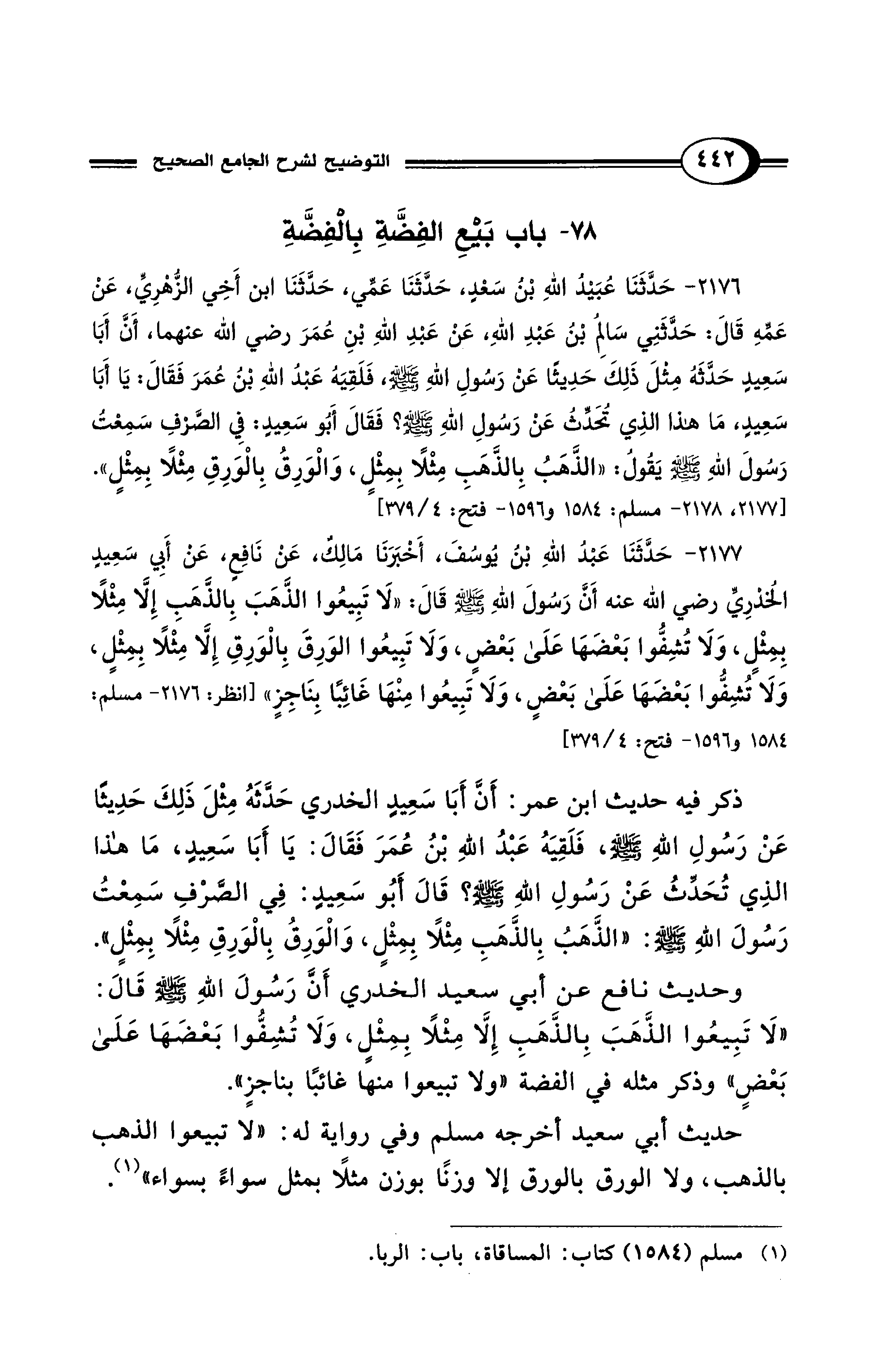 2177 - حَدَّثَنَا عَبْدُ اللهِ بْنُ يُوسُفَ، أَخْبَرَنَا مَالِكٌ، عَنْ نَافِعٍ، عَنْ أَبِي سَعِيدٍ الخُدْرِيِّ رضي الله عنه أَنَّ رَسُولَ اللهِ - صلى الله عليه وسلم - قَالَ: "لَا تَبِيعُوا الذَّهَبَ بِالذَّهَبِ إِلَّا مِثْلًا بِمِثْلٍ، وَلَا تُشِفُّوا بَعْضَهَا عَلَى بَعْضٍ، وَلَا تَبِيعُوا الوَرِقَ بِالوَرِقِ إِلَّا مِثْلًا بِمِثْلٍ، وَلَا تُشِفُّوا بَعْضَهَا عَلَى بَعْضٍ، وَلَا تَبِيعُوا مِنْهَا غَائِبًا بِنَاجِزٍ" [انظر: 2176 - مسلم: 1584 و 1596 - فتح: 4/ 379]