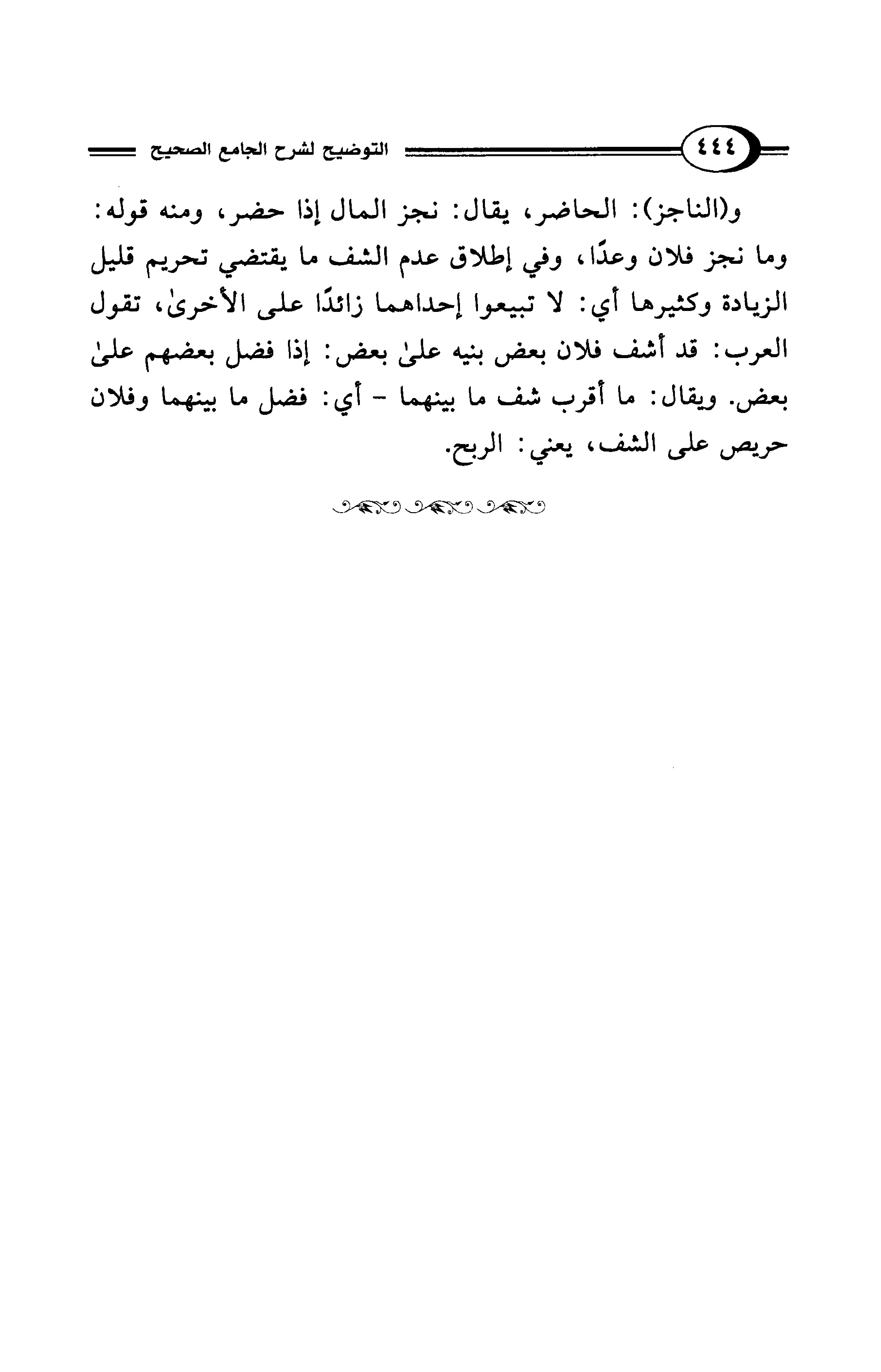 و (الناجز): الحاضر، يقال: نجز المال إذا حضر، ومنه قوله: وما نجز فلان وعدًا، وفي إطلاق عدم الشف ما يقتضي تحريم قليل الزيادة وكثيرها أي: لا تبيعوا إحداهما زائدًا على الأخرى، تقول العرب: قد أشف فلان بعض بنيه على بعض: إذا فضل بعضهم على بعض. ويقال: ما أقرب شف ما بينهما -أي: فضل ما بينهما وفلان حريص على الشف، يعني: الربح.