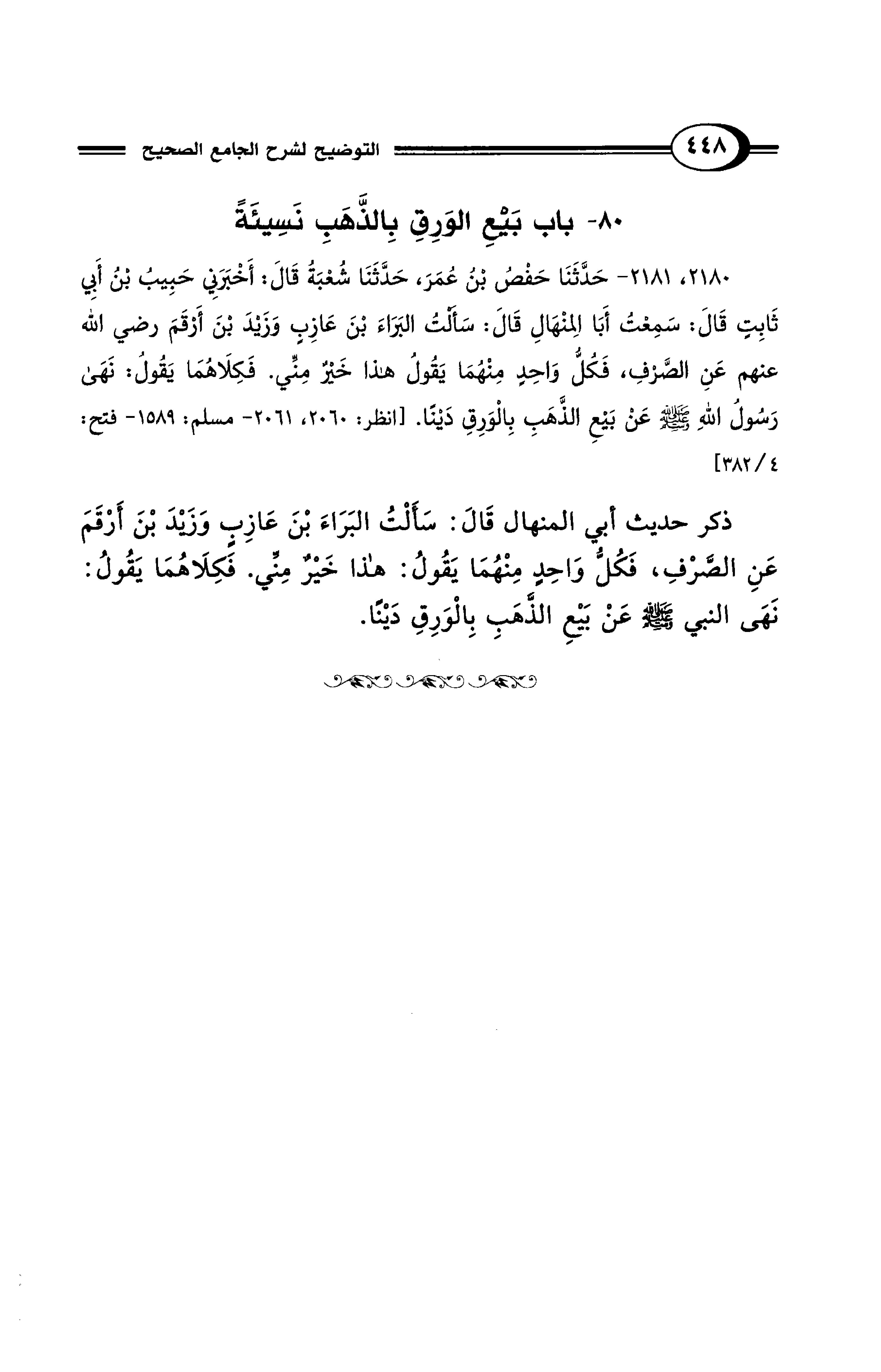 2180 و 2181 - حَدَّثَنَا حَفْصُ بْنُ عُمَرَ، حَدَّثَنَا شُعْبَةُ قَالَ: أَخْبَرَنِي حَبِيبُ بْنُ أَبِي ثَابِتٍ قَالَ: سَمِعْتُ أَبَا المِنْهَالِ قَالَ: سَأَلْتُ البَرَاءَ بْنَ عَازِبٍ وَزَيْدَ بْنَ أَرْقَمَ رضي الله عنهم عَنِ الصَّرْفِ، فَكُلُّ وَاحِدٍ مِنْهُمَا يَقُولُ هَذَا خَيْرٌ مِنِّي. فَكِلاَهُمَا يَقُولُ نَهَى: رَسُولُ اللهِ - صلى الله عليه وسلم - عَنْ بَيْعِ الذَّهَبِ بِالوَرِقِ دَيْنًا. [انظر: 2060، 2061 - مسلم: 1589 - فتح: 4/ 382]