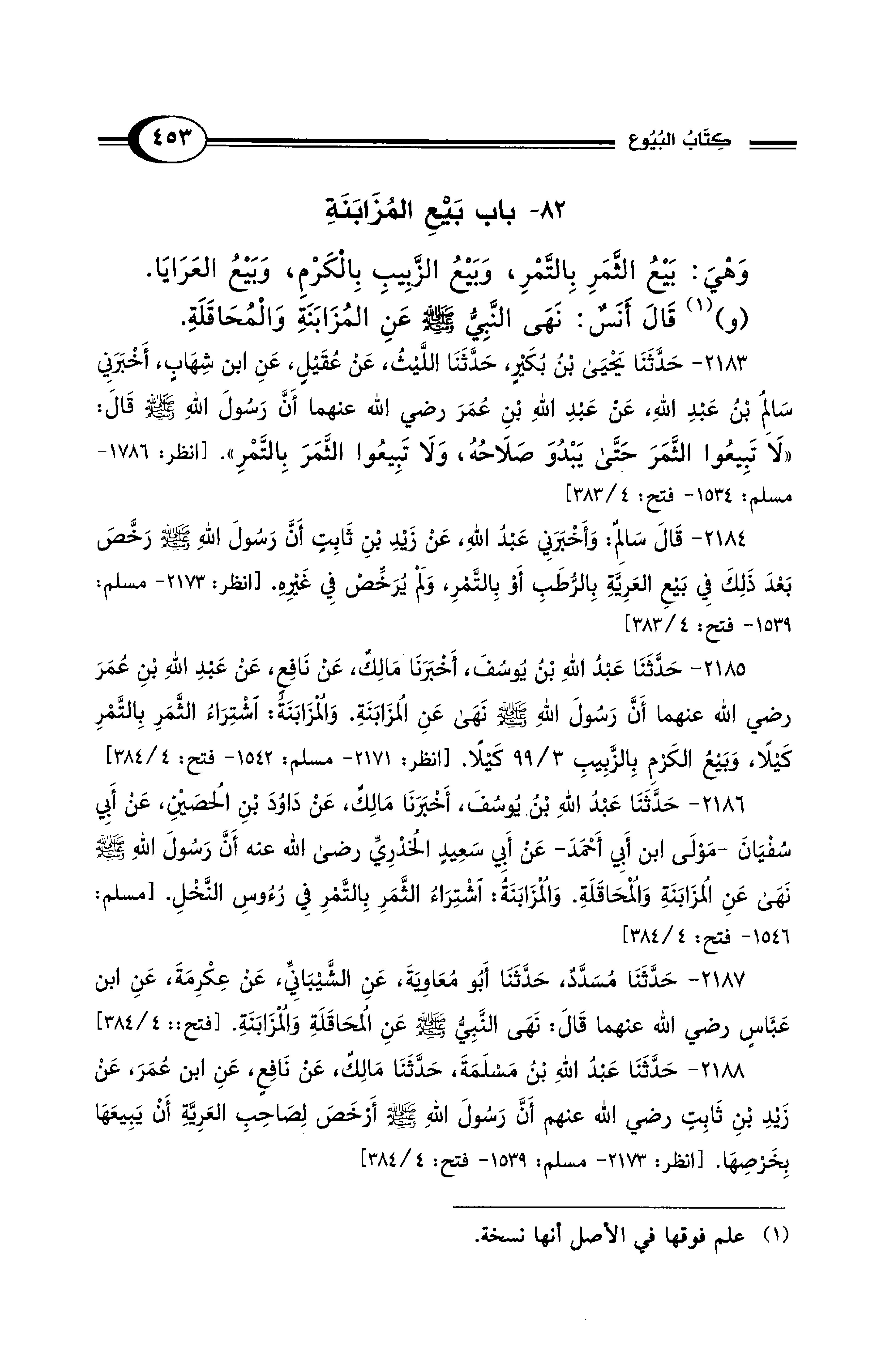 2185 - حَدَّثَنَا عَبْدُ اللهِ بْنُ يُوسُفَ، أَخْبَرَنَا مَالِكٌ، عَنْ نَافِعٍ، عَنْ عَبْدِ اللهِ بْنِ عُمَرَ رضي الله عنهما أَنَّ رَسُولَ اللهِ - صلى الله عليه وسلم - نَهَى عَنِ المُزَابَنَةِ. وَالمُزَابَنَةُ: اشْتِرَاءُ الثَّمَرِ بِالتَّمْرِ كَيْلًا، وَبَيْعُ الكَرْمِ بِالزَّبِيبِ 3/ 99 كَيْلًا. [انظر: 2171 - مسلم: 1542 - فتح: 4/ 384]