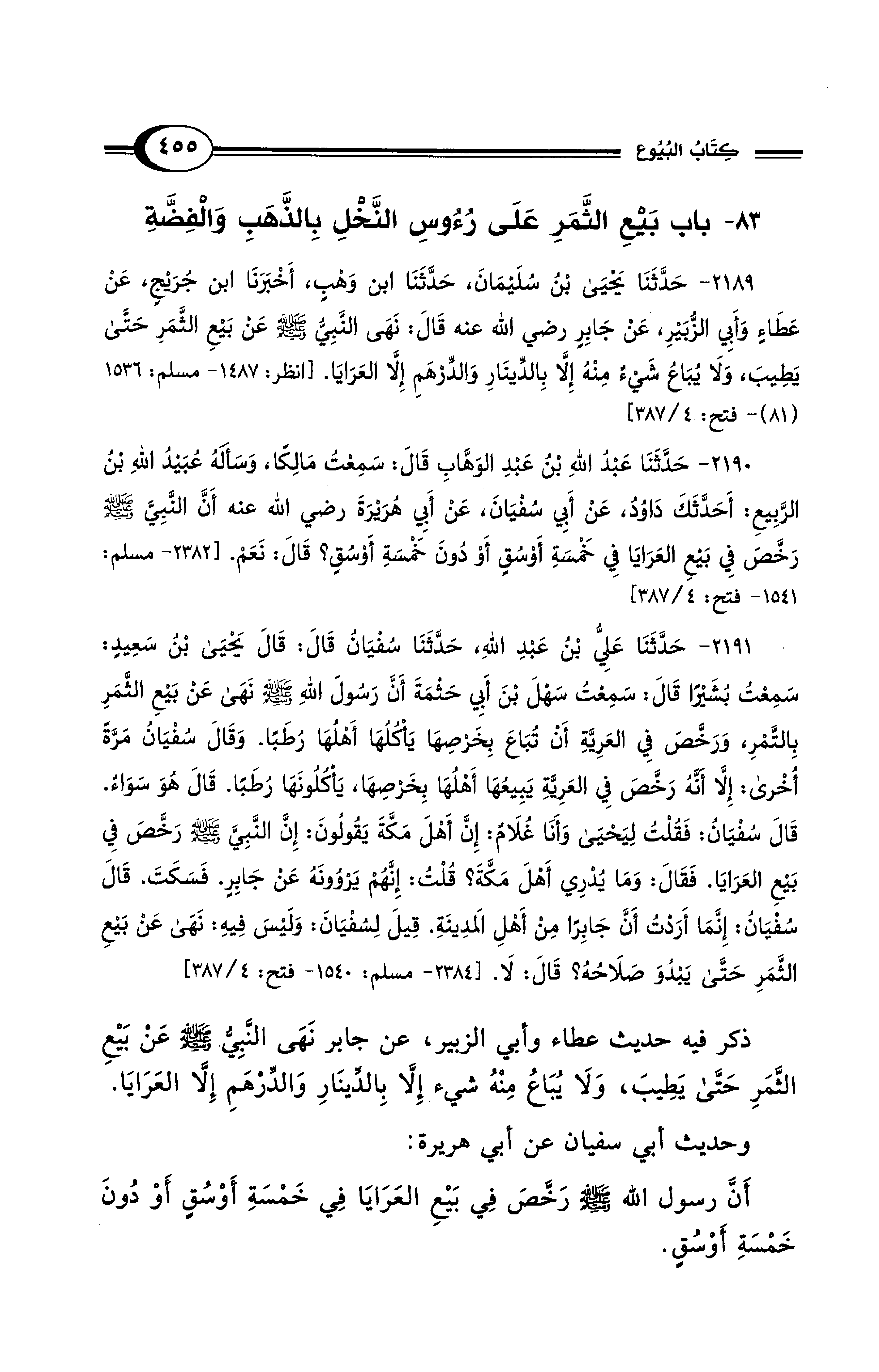 2189 - حَدَّثَنَا يَحْيَى بْنُ سُلَيْمَانَ، حَدَّثَنَا ابن وَهْبٍ، أَخْبَرَنَا ابن جُرَيْجِ، عَنْ عَطَاءٍ وَأبي الزُّبَيْرِ، عَنْ جَابِرٍ رضي الله عنه قَالَ: نَهَى النَّبِيُّ - صلى الله عليه وسلم - عنْ بَيْعِ الثَّمَرِ حَتَّى يَطِيبَ، وَلَا يُبَاعُ شَيْء مِنْهُ إِلَّا بِالدِّينَارِ وَالدِّرْهَمِ إِلَّا العَرَايَا. [انظر: 1487 - مسلم: 1536 (81) - فتح: 4/ 387]