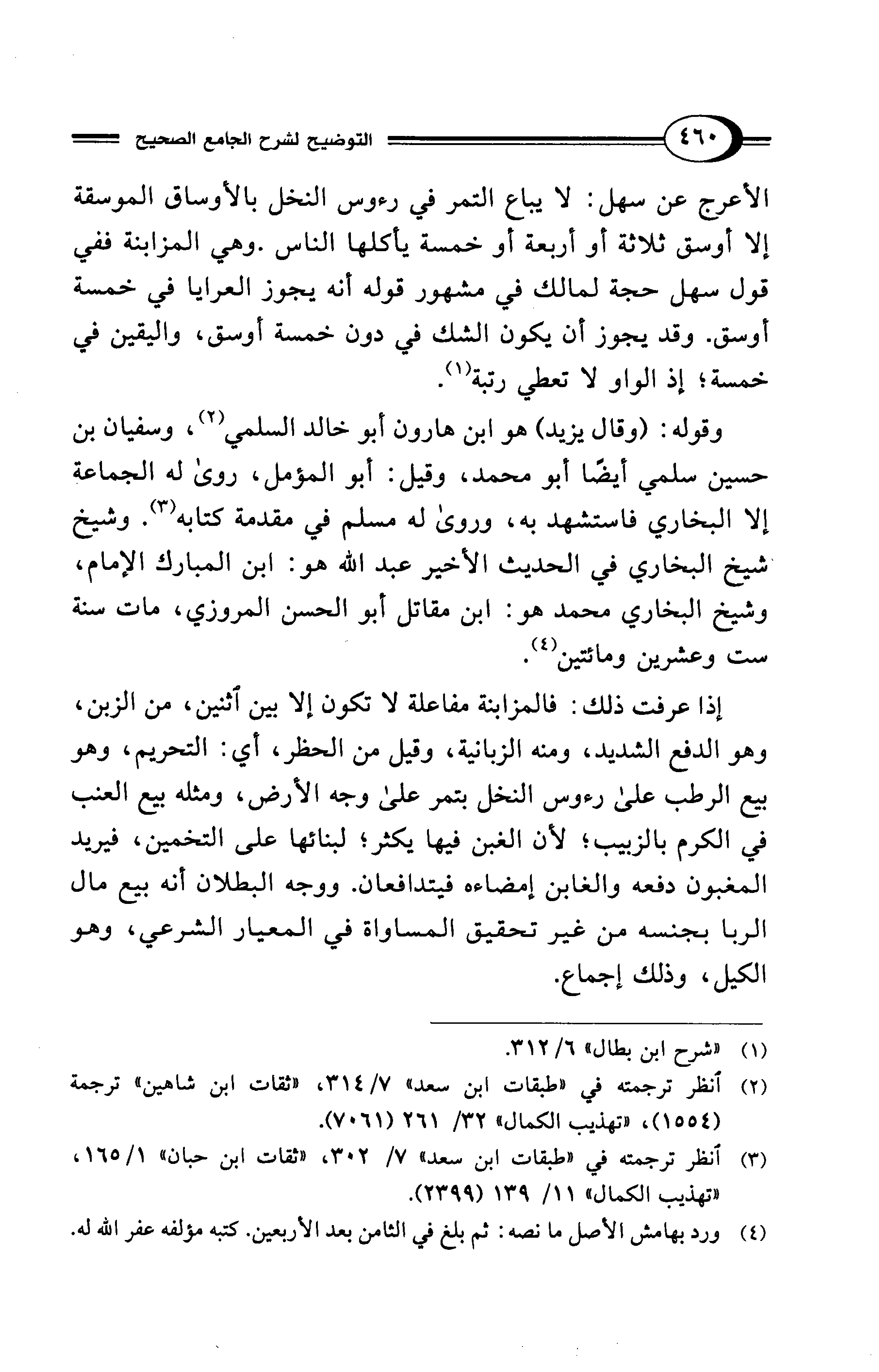 الأعرج عن سهل: لا يباع التمر في رءوس النخل بالأوساق الموسقة إلا أوسق ثلاثة أو أربعة أو خمسة يأكلها الناس. وهي المزابنة ففي قول سهل حجة لمالك في مشهور قوله أنه يجوز العرايا في خمسة أوسق. وقد يجوز أن يكون الشك في دون خمسة أوسق، واليقين في خمسة؛ إذ الواو لا تعطي رتبة (¬1).