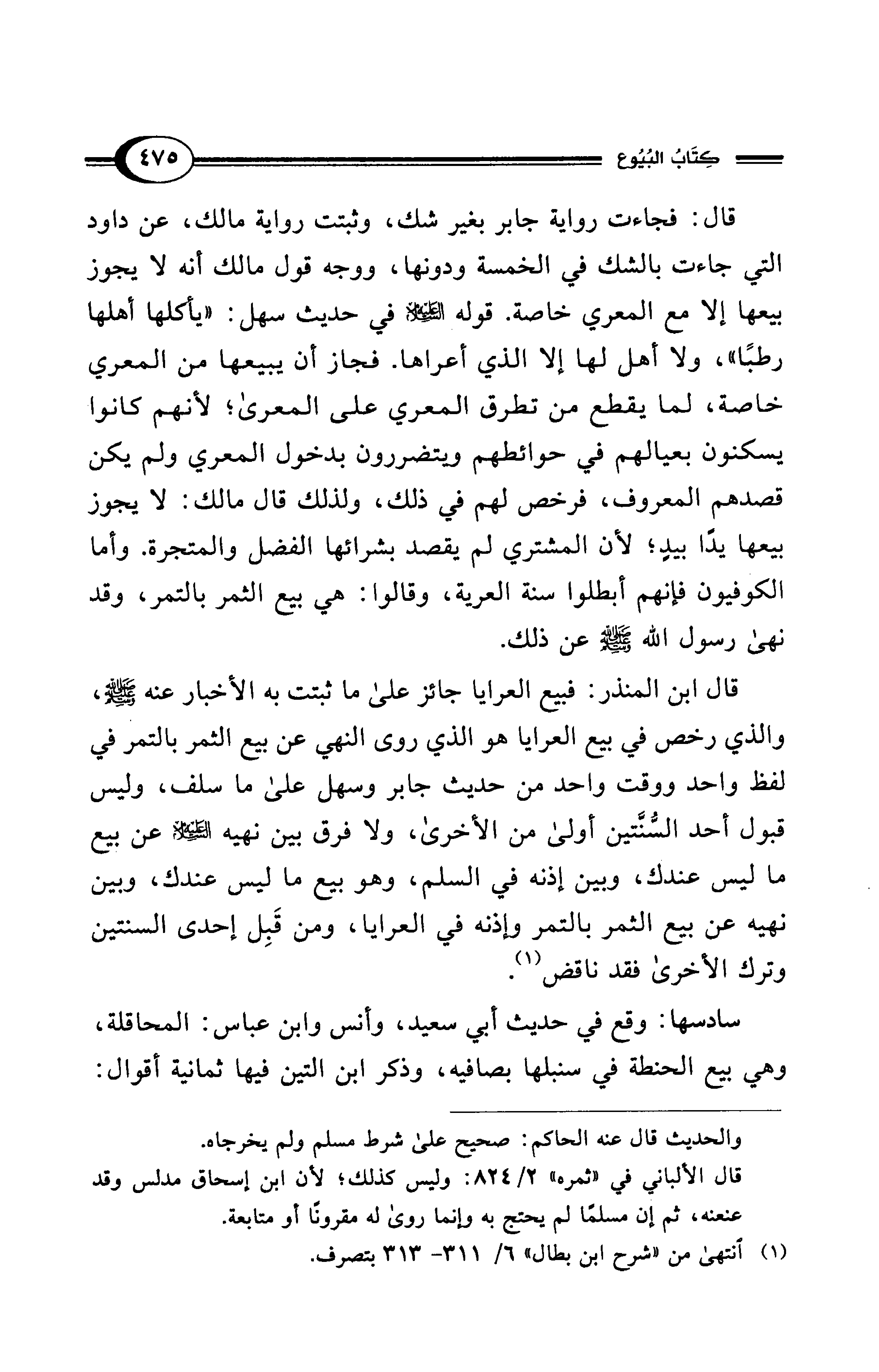 قال ابن المنذر: فبيع العرايا جائز على ما ثبتت به الأخبار عنه - صلى الله عليه وسلم -، والذي رخص في بيع العرايا هو الذي روى النهي عن بيع الثمر بالتمر في لفظ واحد ووقت واحد من حديث جابر وسهل على ما سلف، وليس قبول أحد السُّنَّتين أولى من الأخرى، ولا فرق بين نهيه - عليه السلام - عن بيع ما ليس عندك، وبين إذنه في السلم، وهو بيع ما ليس عندك، وبين نهيه عن بيع الثمر بالتمر وإذنه في العرايا، ومن قَبِل إحدى السنتين وترك الأخرى فقد ناقض (¬1).