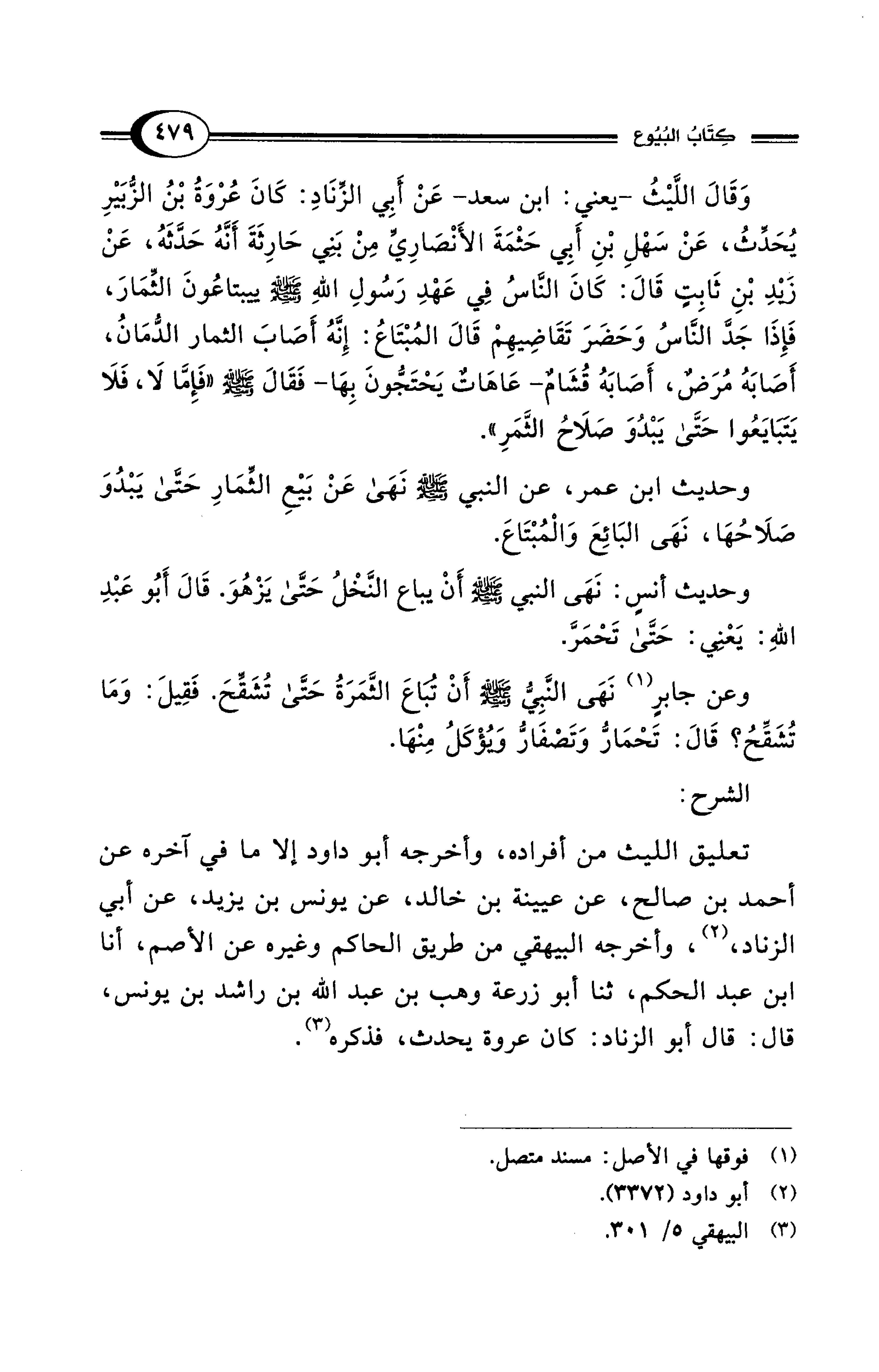 وَقَالَ اللَّيْثُ -يعني: ابن سعد- عَنْ أَبِي الزِّنَادِ: كَانَ عُرْوَةُ بْنُ الزُّبَيْرِ يُحَدِّثُ، عَنْ سَهْلِ بْنِ أَبِي حَثْمَةَ الأَنْصَارِيِّ مِنْ بَنِي حَارِثَةَ أَنَّهُ حَدّثَهُ، عَنْ زَيْدِ بْنِ ثَابِتٍ قَالَ: كَانَ النَّاسُ فِي عَهْدِ رَسُولِ اللهِ - صلى الله عليه وسلم - يبتاعُونَ الثِّمَارَ، فَإِذَا جَدَّ النَّاسُ وَحَضَرَ تَقَاضِيهِمْ قَالَ المُبْتَاعُ: إِنَّهُ أَصَابَ الثمار الدُّمَانُ، أَصَابَهُ مُرَضٌ، أَصَابَهُ قُشَامٌ -عَاهَاتُ يَحْتَجُّونَ بِهَا- فَقَالَ - صلى الله عليه وسلم - "فَإِمَّا لَا، فَلَا يَتَبَايَعُوا حَتَّى يَبْدُوَ صَلَاحُ الثَّمَرِ".