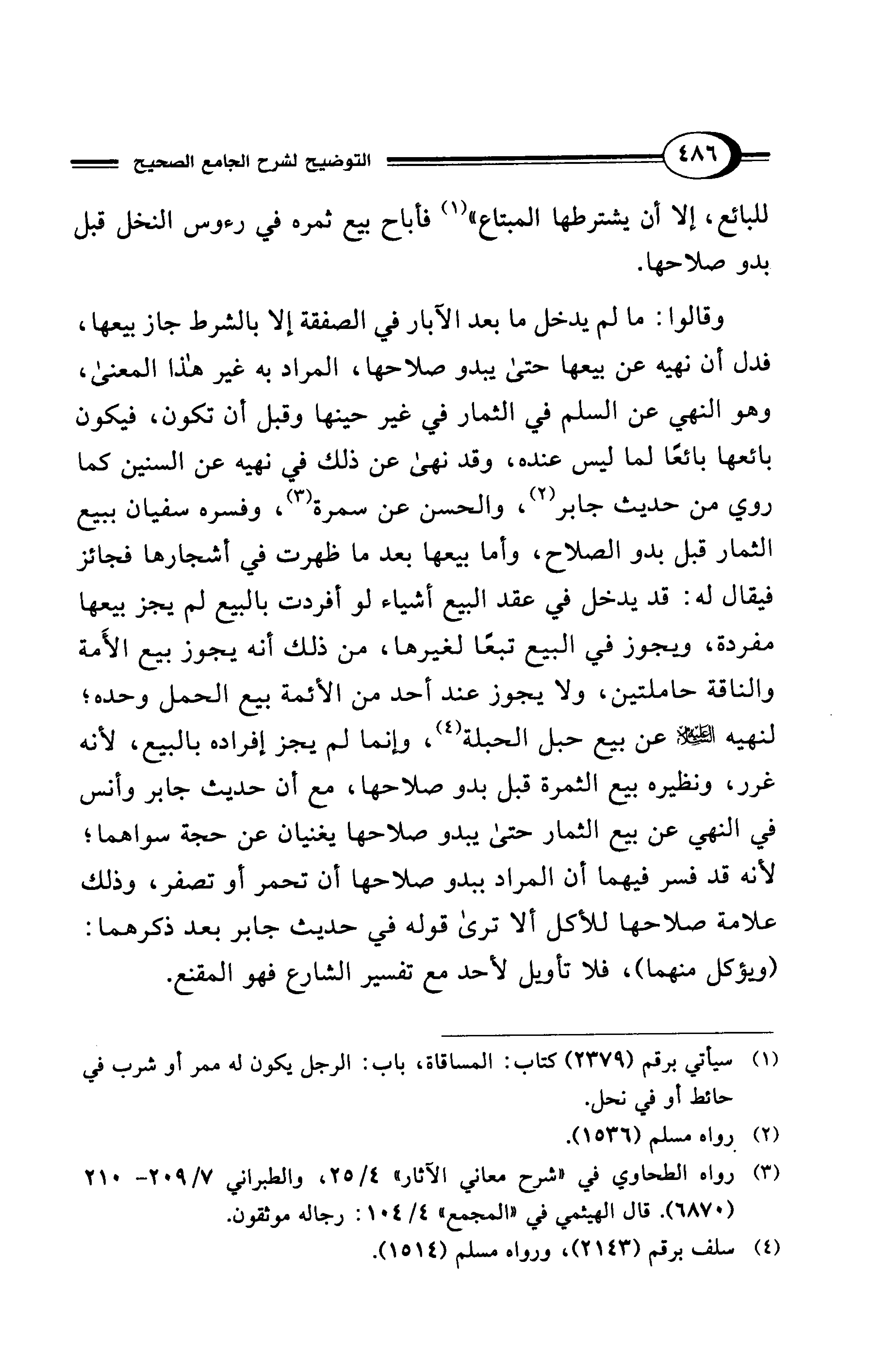 وقالوا: ما لم يدخل ما بعد الآبار في الصفقة إلا بالشرط جاز بيعها، فدل أن نهيه عن بيعها حتى يبدو صلاحها، المراد به غير هذا المعنى، وهو النهي عن السلم في الثمار في غير حينها وقبل أن تكون، فيكون بائعها بائعًا لما ليس عنده، وقد نهى عن ذلك في نهيه عن السنين كما روي من حديث جابر (¬2)، والحسن عن سمرة (¬3)، وفسره سفيان ببيع الثمار قبل بدو الصلاح، وأما بيعها بعدما ظهرت في أشجارها فجائز فيقال له: قد يدخل في عقد البيع أشياء لو أفردت بالبيع لم يجز بيعها مفردة، ويجوز في البيع تبعًا لغيرها، من ذلك أنه يجوز بيع الأَمة والناقة حاملتين، ولا يجوز عند أحد من الأئمة بيع العمل وحده؛ لنهيه - عليه السلام - عن بيع حبل الحبلة (¬4)، وإنما لم يجز إفراده بالبيع، لأنه غرر، ونظيره بيع الثمرة قبل بدو صلاحها، مع أن حديث جابر وأنس في النهي عن بيع الثمار حتى يبدو صلاحها يغنيان عن حجة سواهما؛ لأنه قد فسر فيهما أن المراد ببدو صلاحها أن تحمر أو تصفر، وذلك علامة صلاحها للأكل ألا ترى قوله في حديث جابر بعد ذكرهما: (ويؤكل منهما)، فلا تأويل لأحد مع تفسير الشارع فهو المقنع.