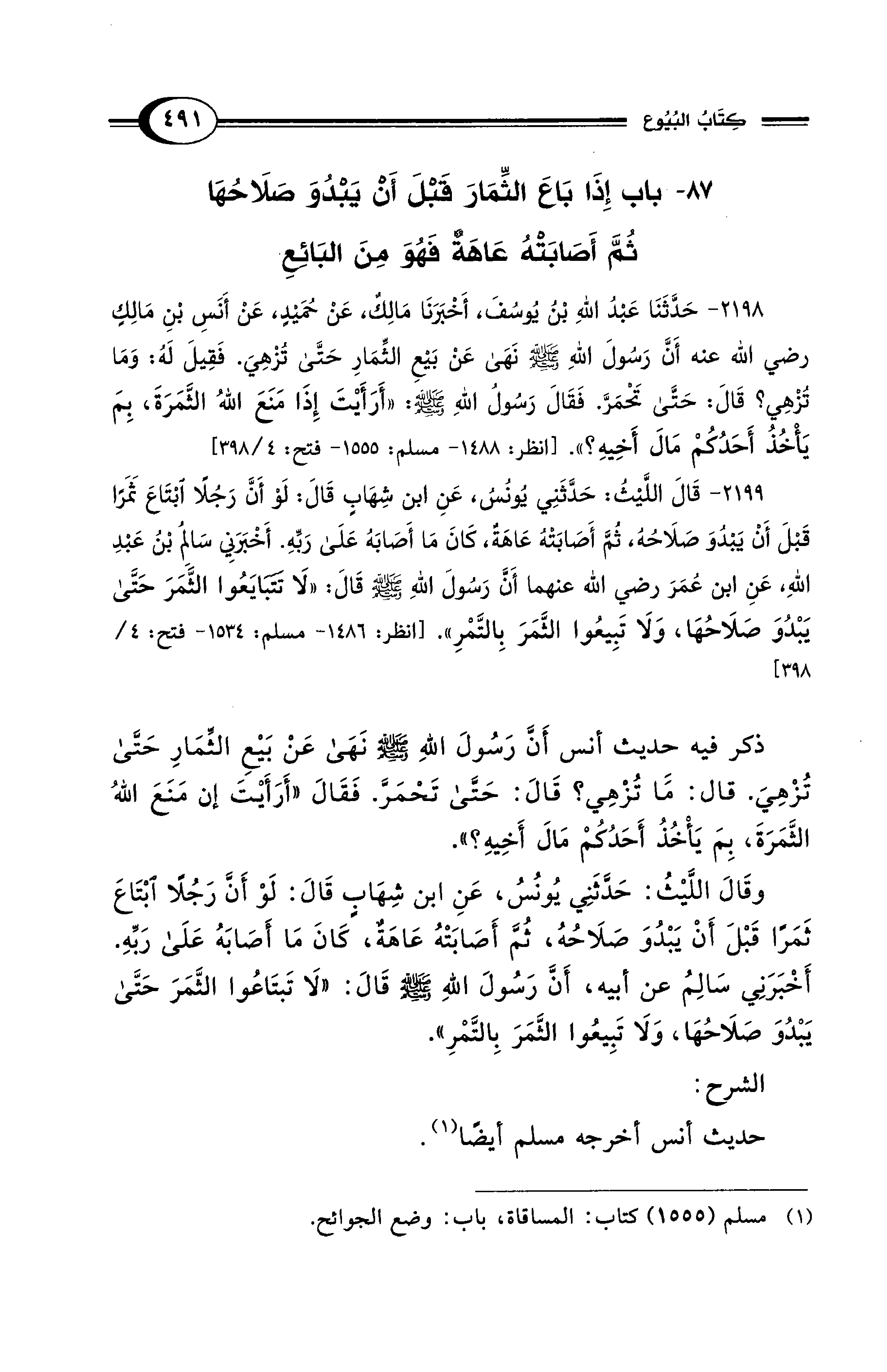 2199 - قَالَ اللَّيْثُ: حَدَّثَنِي يُونُسُ، عَنِ ابْنِ شِهَابٍ قَالَ: لَوْ أَنَّ رَجُلًا ابْتَاعَ ثَمَرًا قَبْلَ أَنْ يَبْدُوَ صَلاَحُهُ، ثُمَّ أَصَابَتْهُ عَاهَةٌ، كَانَ مَا أَصَابَهُ عَلَى رَبِّهِ. أَخْبَرَنِي سَالِمُ بْنُ عَبْدِ اللهِ، عَنِ ابْنِ عُمَرَ رضي الله عنهما أَنَّ رَسُولَ اللهِ - صلى الله عليه وسلم - قَالَ: "لَا تَتَبَايَعُوا الثَّمَرَ حَتَّى يَبْدُوَ صَلاَحُهَا، وَلَا تَبِيعُوا الثَّمَرَ بِالتَّمْرِ". [انظر: 1486 - مسلم: 1534 - فتح: 4/ 398]