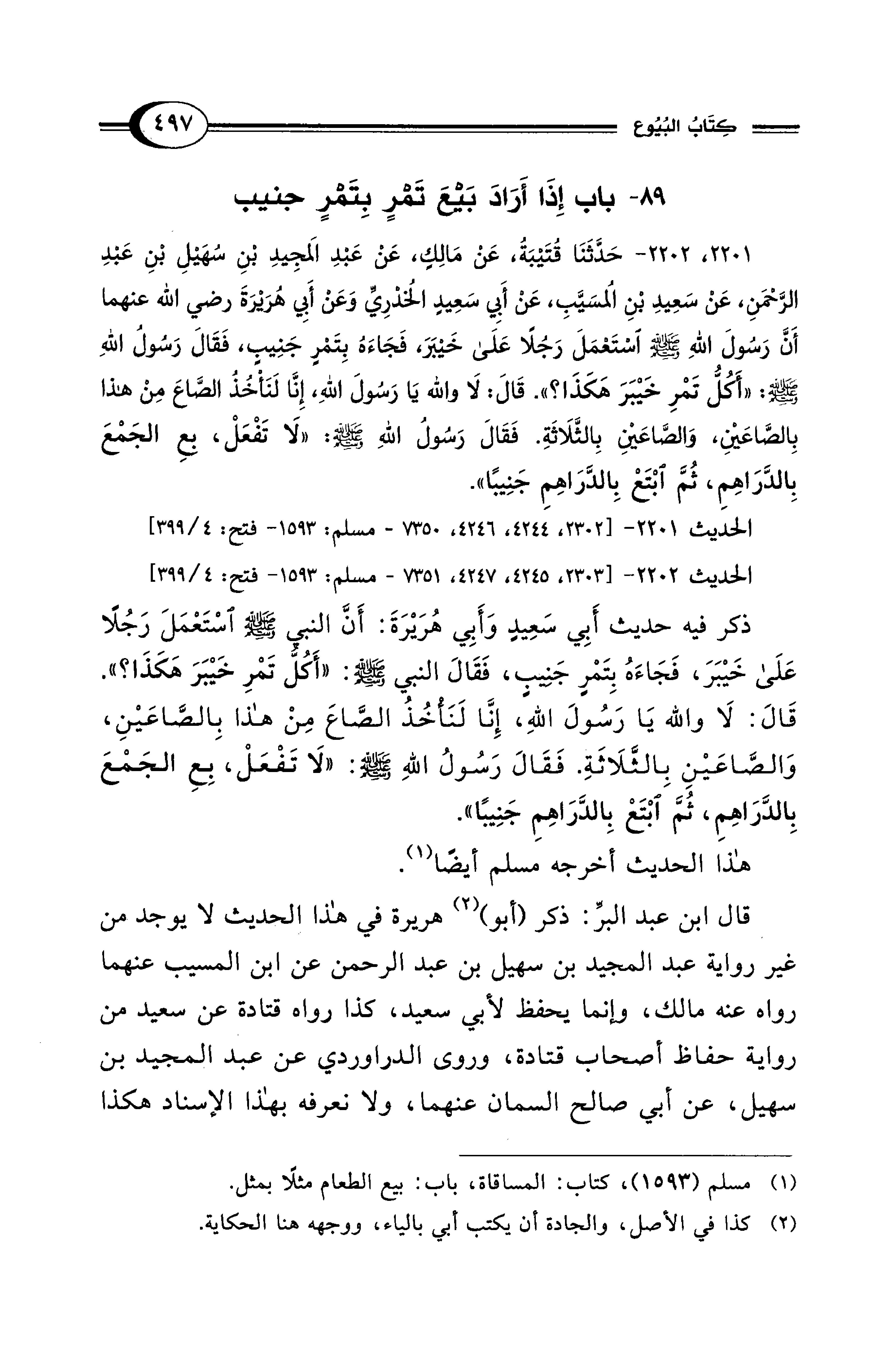 2201، 2202 - حَدَّثَنَا قُتَيْبَةُ، عَنْ مَالِكٍ، عَنْ عَبْدِ المَجِيدِ بْنِ سُهَيْلِ بْنِ عَبْدِ الرَّحْمَنِ، عَنْ سَعِيدِ بْنِ المُسَيَّبِ، عَنْ أَبِي سَعِيدٍ الخُدْرِيِّ وَعَنْ أَبِي هُرَيْرَةَ رضي الله عنهما أَنَّ رَسُولَ اللهِ - صلى الله عليه وسلم - اسْتَعْمَلَ رَجُلًا عَلَى خَيْبَرَ، فَجَاءَهُ بِتَمْرٍ جَنِيبٍ، فَقَالَ رَسُولُ اللهِ - صلى الله عليه وسلم -: "أَكُلُّ تَمْرِ خَيْبَرَ هَكَذَا؟ ". قَالَ: لَا وَاللهِ يَا رَسُولَ اللهِ، إِنَّا لَنَأْخُذُ الصَّاعَ مِنْ هَذَا بِالصَّاعَيْنِ، وَالصَّاعَيْنِ بِالثَّلاَثَةِ. فَقَالَ رَسُولُ اللهِ - صلى الله عليه وسلم -: "لَا تَفْعَلْ، بِعِ الجَمْعَ بِالدَّرَاهِمِ، ثُمَّ ابْتَعْ بِالدَّرَاهِمِ جَنِيبًا".