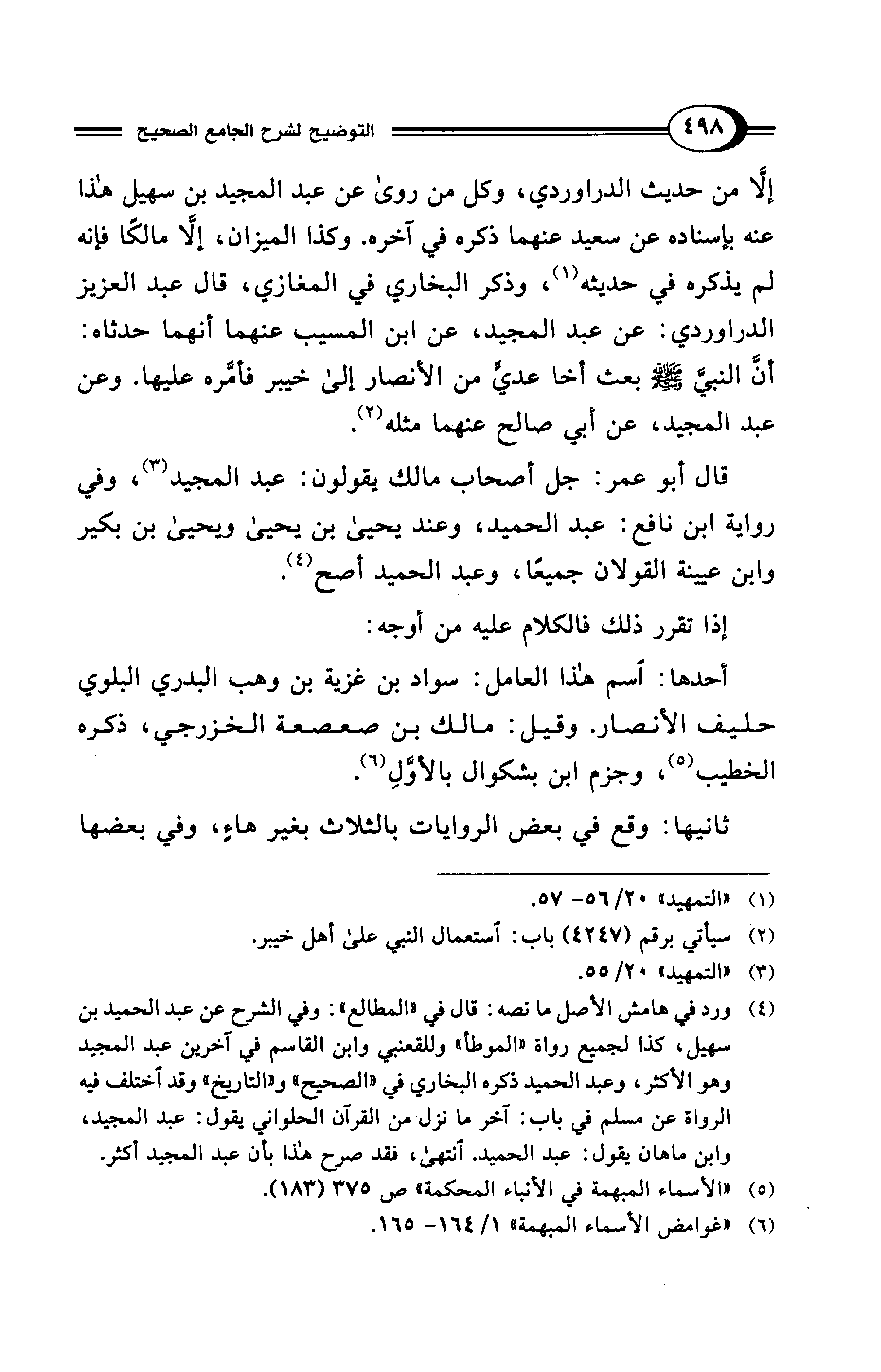 (¬4) ورد في هامش الأصل ما نصه: قال في "المطالع": وفي الشرح عن عبد الحميد بن سهيل، كذا لجميع رواة "الموطأ" وللقعنبي وابن القاسم في آخرين عبد المجيد وهو الأكثر، وعبد الحميد ذكره البخاري في "الصحيح" و"التاريخ" وقد اختلف فيه الرواة عن مسلم في باب: آخر ما نزل من القرآن الحلواني يقول: عبد المجيد، وابن ماهان يقول: عبد الحميد. انتهى، فقد صرح هذا بأن عبد المجيد أكثر.