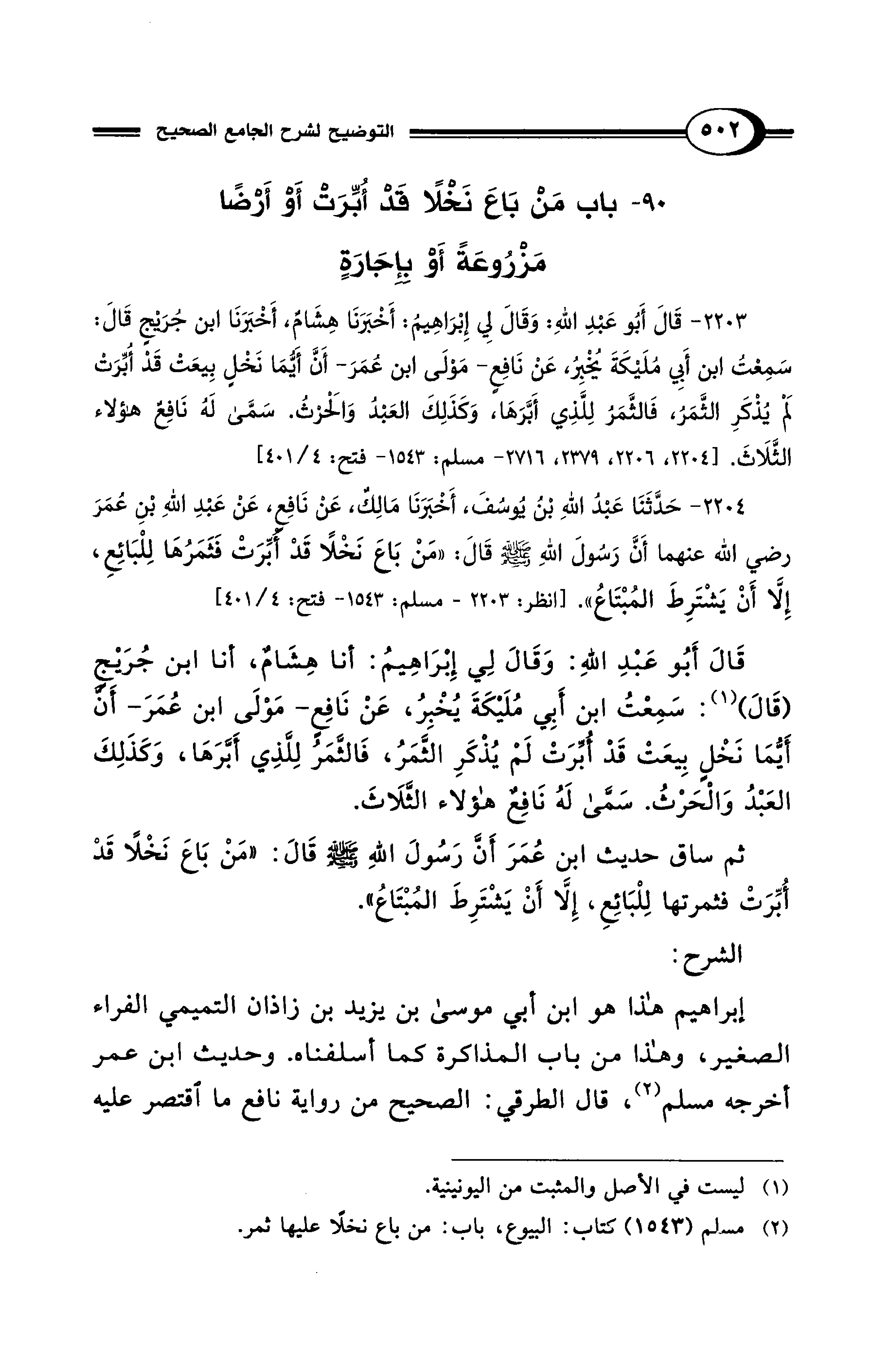 2203 - قَالَ أَبُو عَبْدِ اللهِ: وَقَالَ لِي إِبْرَاهِيمُ: أَخْبَرَنَا هِشَامٌ، أَخْبَرَنَا ابْنُ جُرَيْجٍ قَالَ سَمِعْتُ ابْنَ أَبِي مُلَيْكَةَ يُخْبِرُ، عَنْ نَافِعٍ -مَوْلَى ابْنِ عُمَرَ- أَنَّ أَيُّمَا نَخْلٍ بِيعَتْ قَدْ أُبِّرَتْ لَمْ يُذْكَرِ الثَّمَرُ، فَالثَّمَرُ لِلَّذِي أَبَّرَهَا، وَكَذَلِكَ العَبْدُ وَالحَرْثُ. سَمَّى لَهُ نَافِعٌ هَؤُلاَءِ الثَّلاَثَ. [2204، 2206، 2379، 2716 - مسلم: 1543 - فتح: 4/ 401]