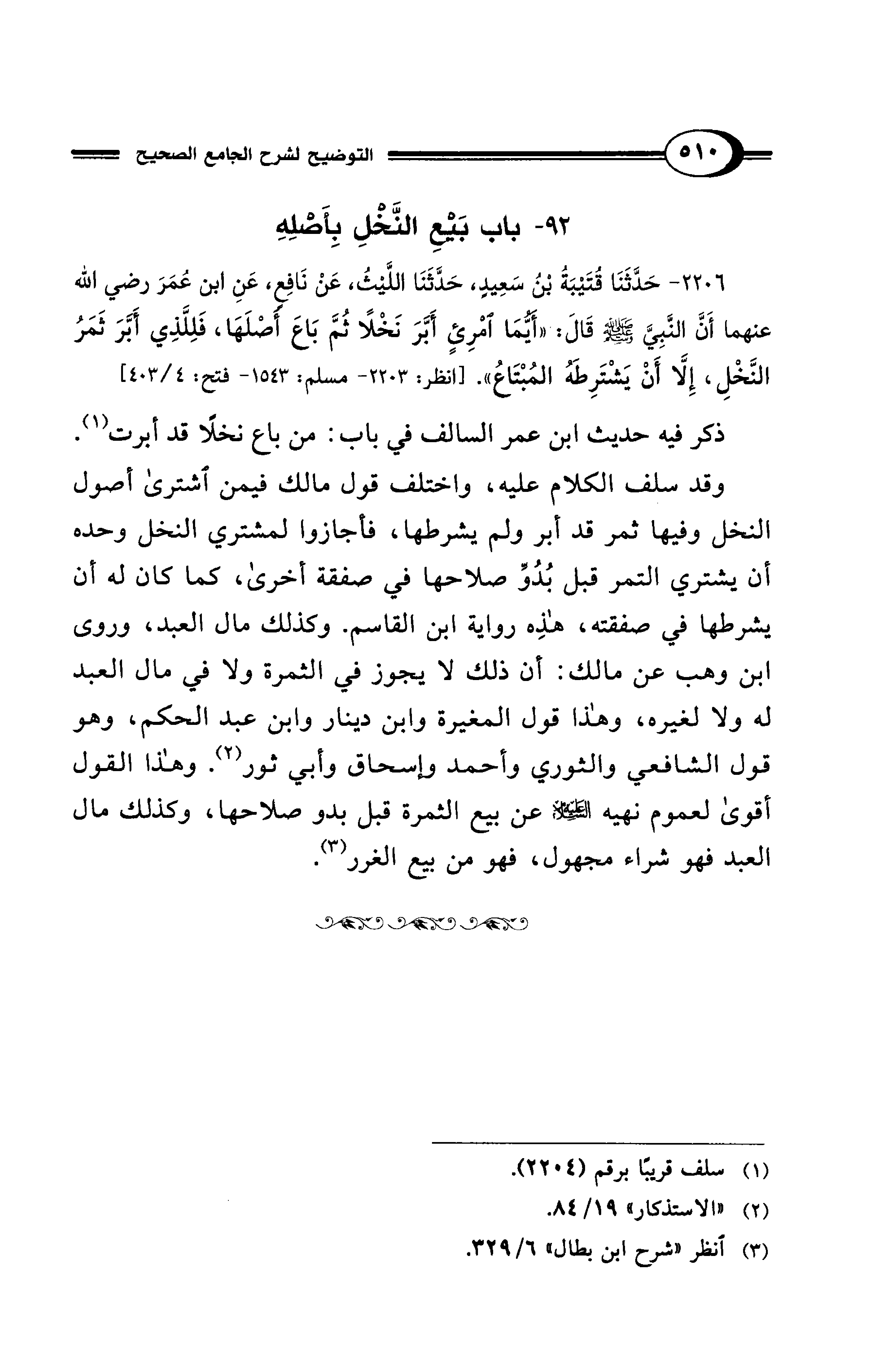 2206 - حَدَّثَنَا قُتَيْبَةُ بْنُ سَعِيدٍ، حَدَّثَنَا اللَّيْثُ، عَنْ نَافِعٍ، عَنِ ابْنِ عُمَرَ رضي الله عنهما أَنَّ النَّبِيَّ - صلى الله عليه وسلم - قَالَ: "أَيُّمَا امْرِئٍ أَبَّرَ نَخْلًا ثُمَّ بَاعَ أَصْلَهَا، فَلِلَّذِي أَبَّرَ ثَمَرُ النَّخْلِ، إِلَّا أَنْ يَشْتَرِطَهُ المُبْتَاعُ". [انظر: 2203 - مسلم: 1543 - فتح: 4/ 403]