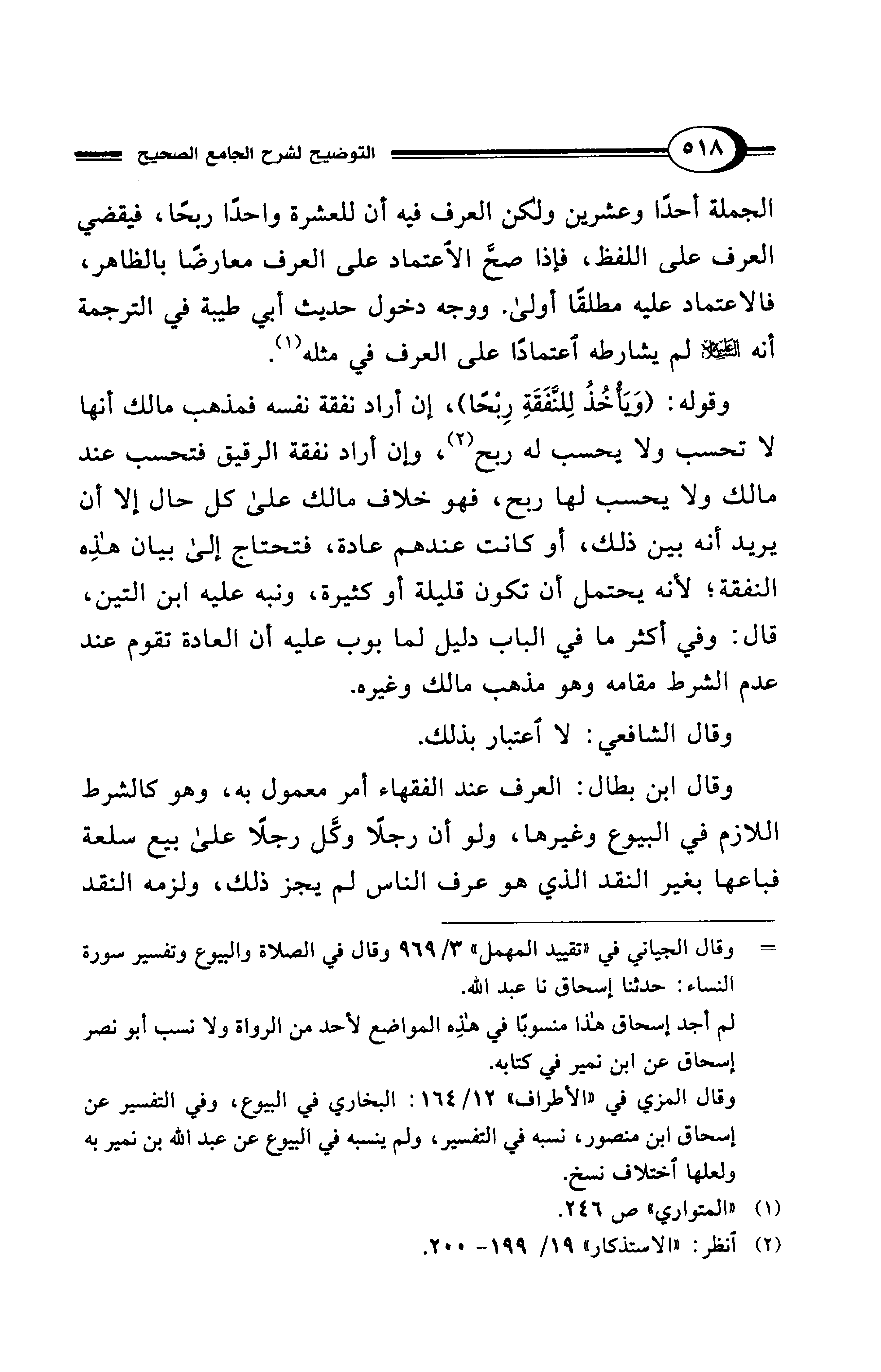 وقوله: (وَيَأْخُذُ لِلنَّفَقَةِ رِبْحًا)، إن أراد نفقة نفسه فمذهب مالك أنها لا تحسب ولا يحسب له ربح (¬2)، وإن أراد نفقة الرقيق فتحسب عند مالك ولا يحسب لها ربح، فهو خلاف مالك على كل حال إلا أن يريد أنه بين ذلك، أو كانت عندهم عادة، فتحتاج إلى بيان هذِه النفقة؛ لأنه يحتمل أن تكون قليلة أو كثيرة، ونبه عليه ابن التين، قال: وفي أكثر ما في الباب دليل لما بوب عليه أن العادة تقوم عند