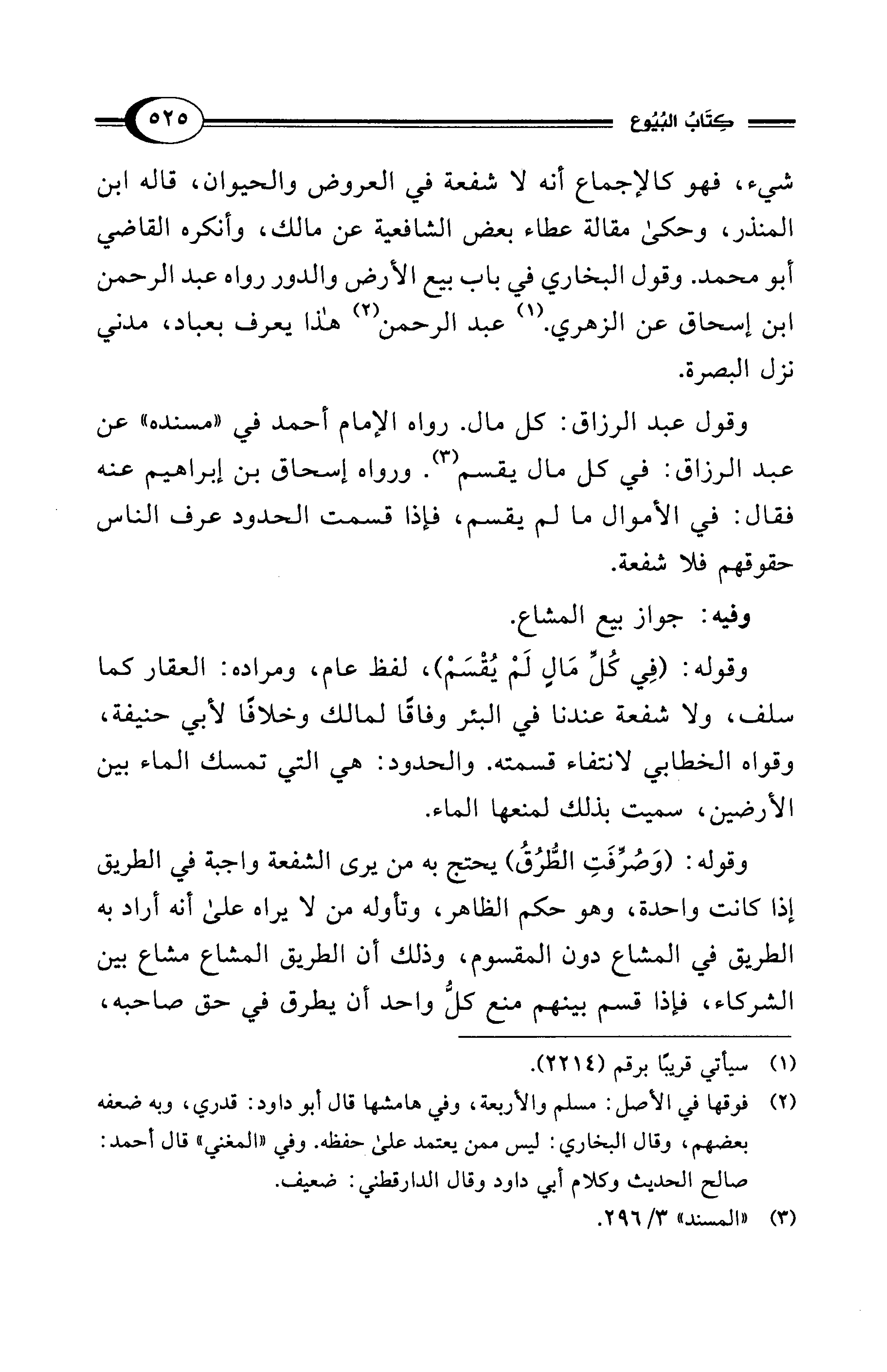وقول عبد الرزاق: كل مال. رواه الإمام أحمد في "مسنده" عن عبد الرزاق: في كل مال يقسم (¬3). ورواه إسحاق بن إبراهيم عنه فقال: في الأموال ما لم يقسم، فإذا قسمت الحدود عرف الناس حقوقهم فلا شفعة.