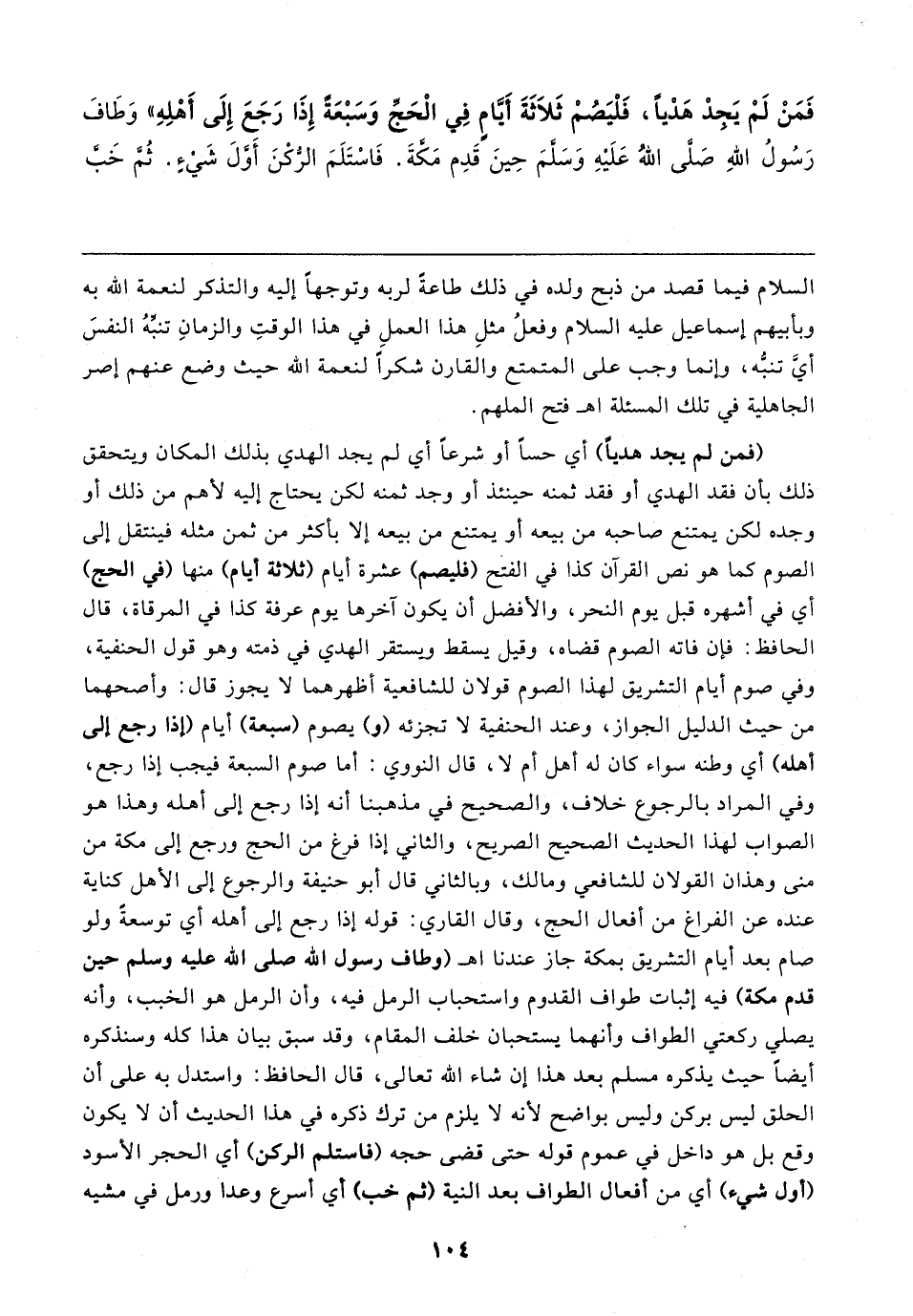 فَمَنْ لَمْ يَجدْ هَدْيًا، فَلْيَصُمْ ثَلاثَةَ أَيَّامٍ فِي الْحَجِّ وَسَبْعَة إِذَا رَجَعَ إِلَى أَهْلِهِ" وَطَافَ رَسُولُ اللهِ صَلَّى اللهُ عَلَيهِ وَسَلَّمَ حِينَ قَدِم مَكةَ. فَاسْتَلَمَ الرُّكْنَ أَوَّلَ شَيءٍ. ثُمَّ خَبَّ