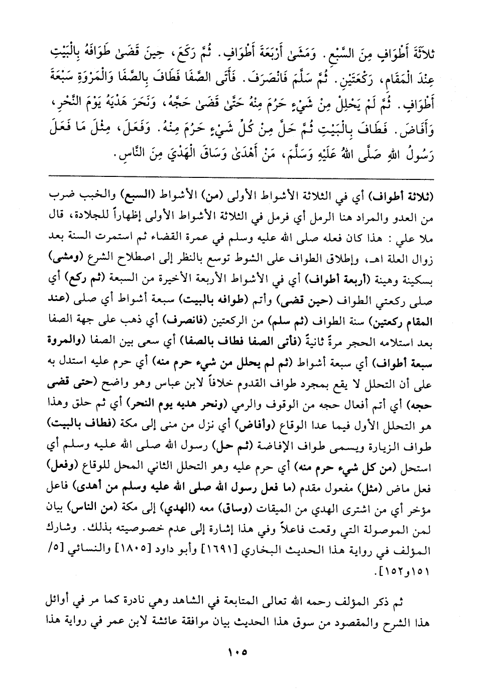 (ثلاثة أطواف) أي في الثلاثة الأشواط الأولى (من) الأشواط (السبع) والخبب ضرب من العدو والمراد هنا الرمل أي فرمل في الثلاثة الأشواط الأولى إظهارًا للجلادة، قال ملا علي: هذا كان فعله صلى الله عليه وسلم في عمرة القضاء ثم استمرت السنة بعد زوال العلة اهـ، وإطلاق الطواف على الشوط توسع بالنظر إلى اصطلاح الشرع (ومشى) بسكينة وهينة (أربعة أطواف) أي في الأشواط الأربعة الأخيرة من السبعة (ثم ركع) أي صلى ركعتي الطواف (حين قضى) وأتم (طوافه بالبيت) سبعة أشواط أي صلى (عند المقام ركعتين) سنة الطواف (ثم سلم) من الركعتين (فانصرت) أي ذهب على جهة الصفا بعد استلامه الحجر مرةً ثانيةً (فأتى الصفا فطاف بالصفا) أي سعى بين الصفا (والمروة سبعة أطواف) أي سبعة أشواط (ثم لم يحلل من شيء حرم منه) أي حرم عليه استدل به على أن التحلل لا يقع بمجرد طواف القدوم خلافًا لابن عباس وهو واضح (حتى قضى حجه) أي أتم أفعال حجه من الوقوف والرمي (ونحر هديه يوم النحر) أي ثم حلق وهذا هو التحلل الأول فيما عدا الوقاع (وأفاض) أي نزل من منى إلى مكة (فطاف بالبيت) طواف الزيارة ويسمى طواف الإفاضة (ثم حل) رسول الله صلى الله عليه وسلم أي استحل (من كل شيء حرم منه) أي حرم عليه وهو التحلل الثاني المحل للوقاع (وفعل) فعل ماض (مثل) مفعول مقدم (ما فعل رسول الله صلى الله عليه وسلم من أهدى) فاعل مؤخر أي من اشترى الهدي من الميقات (وساق) معه (الهدي) إلى مكة (من الناس) بيان لمن الموصولة التي وقعت فاعلًا وفي هذا إشارة إلى عدم خصوصيته بذلك. وشارك المؤلف في رواية هذا الحديث البخاري [١٦٩١] وأبو داود [١٨٠٥] والنسائي [٥/ ١٥١ و ١٥٢].
