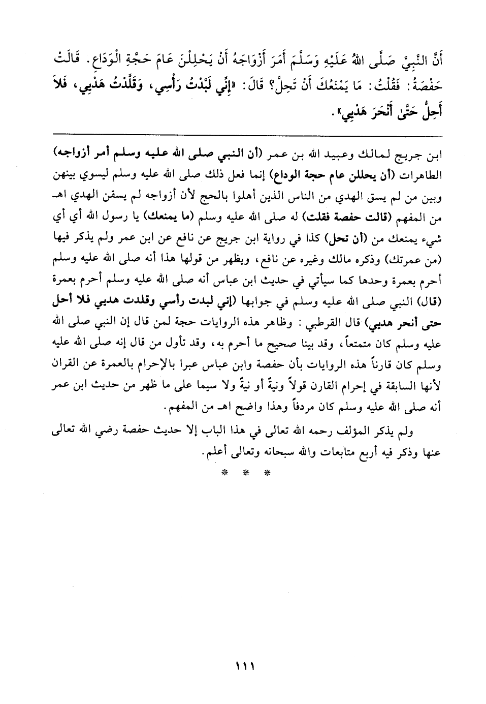 أن النَّبِيَّ صَلَّى اللهُ عَلَيهِ وَسَلَّمَ أَمَرَ أَزْوَاجَهُ أَنْ يَحْلِلْنَ عَامَ حَجَّةِ الْوَدَاعِ. قَالتْ حَفْصَةُ: فَقُلْتُ: مَا يَمْنَعُكَ أَنْ تَحِلَّ؟ قَال: "إِنِّي لَبَّدْتُ رَأْسِي، وَقَلَّدْتُ هَدْيِي، فَلَا أَحِلُّ حَتى أَنْحَرَ هَدْيِيِ"