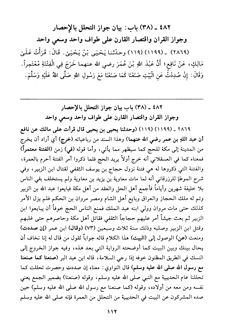 ٤٨٢ - (٣٨) باب بيان جواز التحلل بالإحصار وجواز القران واقتصار القارن على طواف واحد وسعي واحد