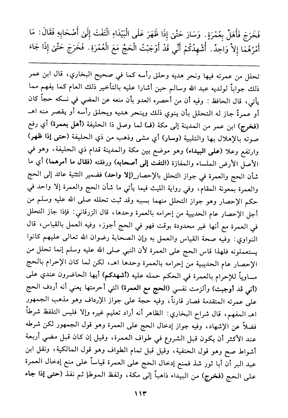 فَخَرَجَ فَأَهَلَّ بِعُمْرَةٍ. وَسَارَ حَتَّى إِذَا ظَهَرَ عَلَى الْبَيدَاءِ الْتَفَتَ إِلَى أَصْحَابِهِ فَقَال: مَا أَمْرُهُمَا إِلَّا وَاحِدٌ. أُشْهِدُكُمْ أَنِّي قَدْ أَوْجَبْتُ الْحَجَّ مَعَ الْعُمْرَةِ. فَخَرَجَ حَتَّى إِذَا جَاءَ