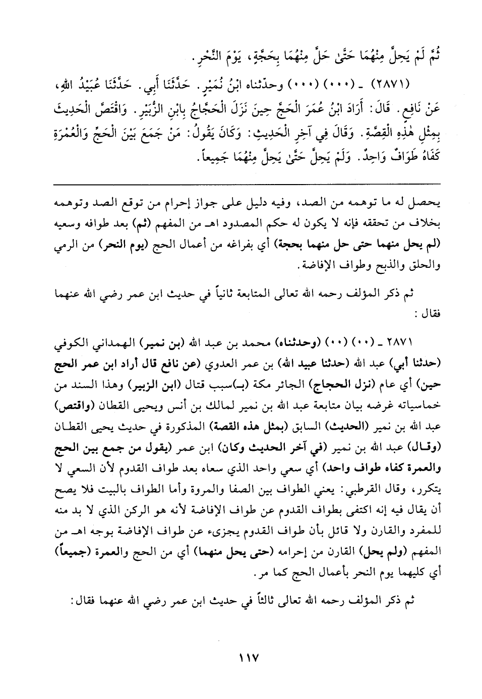 ٢٨٧١ - (٠٠) (٠٠) (وحدثناه) محمد بن عبد الله (بن نمير) الهمداني الكوفي (حدثنا أبي) عبد الله (حدثنا عبيد الله) بن عمر العدوي (عن نافع قال أراد ابن عمر الحج حين) أي عام (نزل الحجاج) الجائر مكة (بـ) سبب قتال (ابن الزبير) وهذا السند من خماسياته غرضه بيان متابعة عبد الله بن نمير لمالك بن أنس ويحيى القطان (واقتص) عبد الله بن نمير (الحديث) السابق (بمثل هذه القصة) المذكورة في حديث يحيى القطان (وقال) عبد الله بن نمير (في آخر الحديث وكان) ابن عمر (يقول من جمع بين الحج والعمرة كفاه طواف واحد) أي سعي واحد الذي سعاه بعد طواف القدوم لأن السعي لا يتكرر، وقال القرطبي: يعني الطواف بين الصفا والمروة وأما الطواف بالبيت فلا يصح أن يقال فيه إنه اكتفى بطواف القدوم عن طواف الإفاضة لأنه هو الركن الذي لا بد منه للمفرد والقارن ولا قالْل بان طواف القدوم يجزئ عن طواف الإفاضة بوجه اهـ من المفهم (ولم يحل) القارن من إحرامه (حتى يحل منهما) أي من الحج والعمرة (جميعًا) أي كليهما يوم النحر باعمال الحج كما مر.