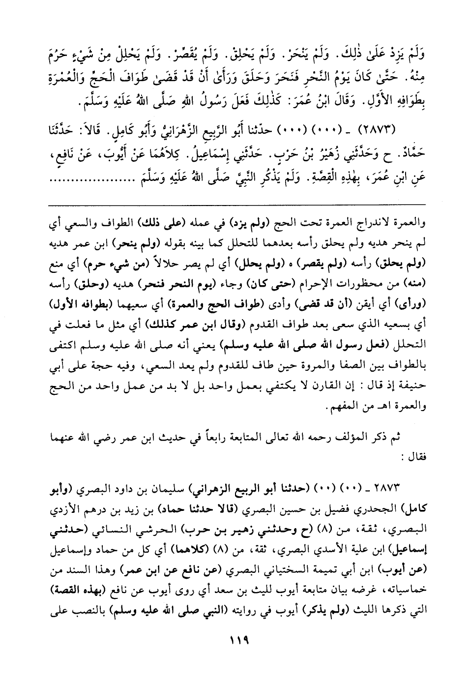 ٢٨٧٣ - (٠٠) (٠٠) (حدثنا أبو الربيع الزهراني) سليمان بن داود البصري (وأبو كامل) الجحدري فضيل بن حسين البصري (قالا حدثنا حماد) بن زيد بن درهم الأزدي البصري، ثقة، من (٨) (ح وحدثني زهير بن حرب) الحرشي النسائي (حدثني إسماعيل) ابن علية الأسدي البصري، ثقة، من (٨) (كلاهما) أي كل من حماد وإسماعيل (عن أيوب) ابن أبي تميمة السختياني البصري (عن نافع عن ابن عمر) وهذا السند من خماسياته، غرضه بيان متابعة أيوب لليث بن سعد أي روى أيوب عن نافع (بهذه القصة) التي ذكرها الليث (ولم يذكر) أيوب في روايته (النبي صلى الله عليه وسلم) بالنصب على