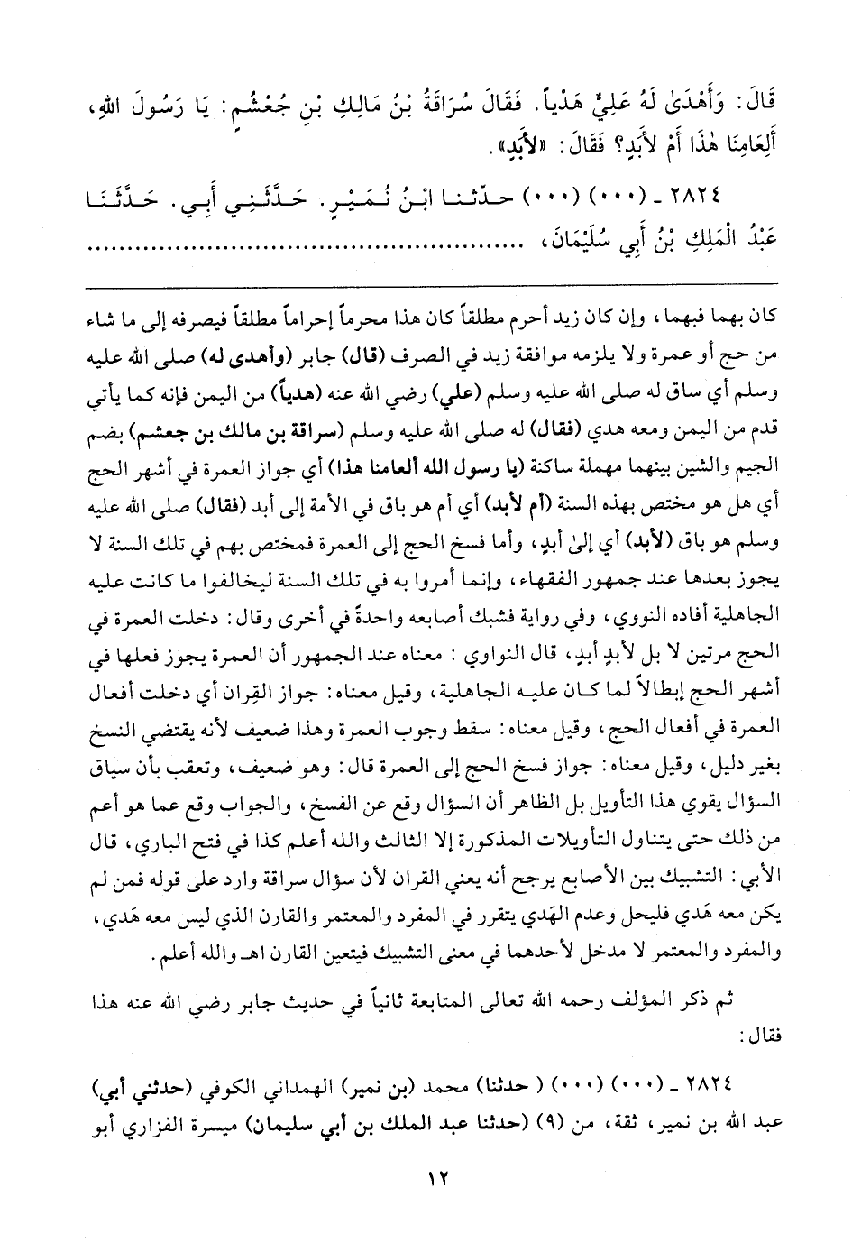 قَال: وَأَهْدَى لَهُ عَلِيٌّ هَدْيًا. فَقَال سُرَاقَةُ بْنُ مَالِكِ بْنِ جُعْشُمٍ: يَا رَسُولَ اللهِ، أَلِعَامِنَا هذَا أَمْ لأَبَدِ؟ فَقَال: "لأَبَدِ".