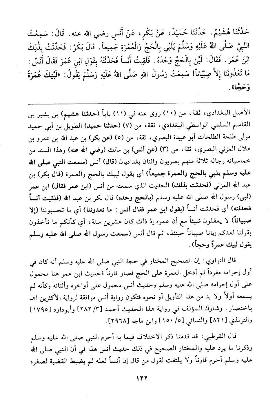 حَدَّثَنَا هُشَيمٌ. حَدَّثَنَا حُمَيدٌ، عَنْ بَكْرٍ، عَنْ أَنَسٍ رضي الله عنه. قَال: سَمِعْتُ النَّبِيّ صَلى اللهُ عَلَيهِ وَسَلَّمَ يُلَبِّي بِالْحَجِّ وَالْعُمْرَةِ جَمِيعًا. قَال بَكْرٌ: فَحَدَّثْتُ بِذلِكَ ابْنَ عُمَرَ. فَقَال: لَبَّى بِالْحَجِّ وَحْدَهُ. فَلَقِيتُ أَنَسًا فَحَدَّثْتُهُ بِقَوْلِ ابْنِ عُمَرَ فَقَال أَنَسٌ: مَا تَعُدُّونَنَا إِلَّا صِبْيَانًا! سَمِعْتُ رَسُولَ اللهِ صَلَّى اللهُ عَلَيهِ وَسلَّمَ يَقُولُ: "لَبَّيكَ عُمْرَةَ وَحَجًّا"
