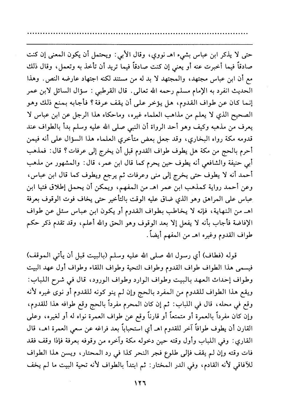 حتى لا يذكر ابن عباس بشيء اهـ نووي، وقال الأبي: ويحتمل أن يكون المعنى إن كنت صادقًا فيما أخبرت عنه أو يعني إن كنت صادقًا فيما تريد أن تأخذ به وتعمل، وقال ذلك مع أن ابن عباس مجتهد، والمجتهد لا بد له من مستند لكنه اجتهاد عارضه النص. وهذا الحديث انفرد به الإمام مسلم رحمه الله تعالى. قال القرطبي: سؤال السائل لابن عمر إنما كان عن طواف القدوم، هل يؤخر على أن يقف عرفة؟ فأجابه بمنع ذلك وهو الصحيح الذي لا يعلم من مذاهب العلماء غيره، وما حكاه هذا الرجل عن ابن عباس لا يعرف من مذهبه وكيف وهو أحد الرواة أن النبي صلى الله عليه وسلم بدأ بالطواف عند قدومه مكة رواه البخاري، وقد جعل بعض متأخري العلماء هذا السؤال على أنه فيمن أحرم بالحج من مكة هل يطوف طواف القدوم قبل أن يخرج إلى عرفات؟ قال: فمذهب أبي حنيفة والشافعي أنه يطوف حين يحرم كما قال ابن عمر، قال: والمشهور من مذهب أحمد أنه لا يطوف حتى يخرج إلى منى وعرفات ثم يرجع ويطوف كما قال ابن عباس، وعن أحمد رواية كمذهب ابن عمر اهـ من المفهم، ويمكن أن يحمل إطلاق فتيا ابن عباس على المراهق وهو الذي ضاق عليه الوقت بالتأخير حتى يخاف فوت الوقوف بعرفة اهـ من النهاية، فإنه لا يخاطب بطواف القدوم أو يكون ابن عباس سئل عن طواف الإفاضة فأجاب بأنه لا يفعل إلا بعد الوقوف وهو الحق والله أعلم، وقد تقدم ذكر حكم طواف القدوم وغيره اهـ من المفهم أيضًا.