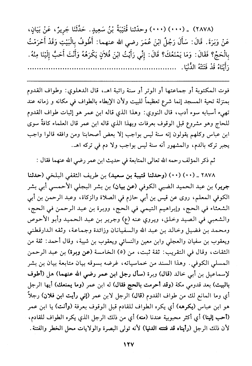 (٢٨٧٨) - (٠٠) (٠٠) وحدّثنا قُتَيبَةُ بْنُ سَعِيدٍ. حَدَّثَنَا جَرِيرٌ، عَنْ بَيَانٍ، عَنْ وَبَرَةَ. قَال: سَأَلَ رَجُلٌ ابْنَ عُمَرَ رضي الله عنهما: أَطُوفُ بِالْبَيتِ وَقَدْ أَحْرمْتُ بِالْحَجِّ؟ فَقَال: وَمَا يَمْنَعُكَ؟ قَال: إِنًي رَأَيتُ ابْنَ فُلانٍ يَكْرَهُهُ وَأَنْتَ أحَبُّ إِلَينَا مِنْهُ. رَأَينَاهُ قَدْ فَتَنَتْهُ الدُنْيَا