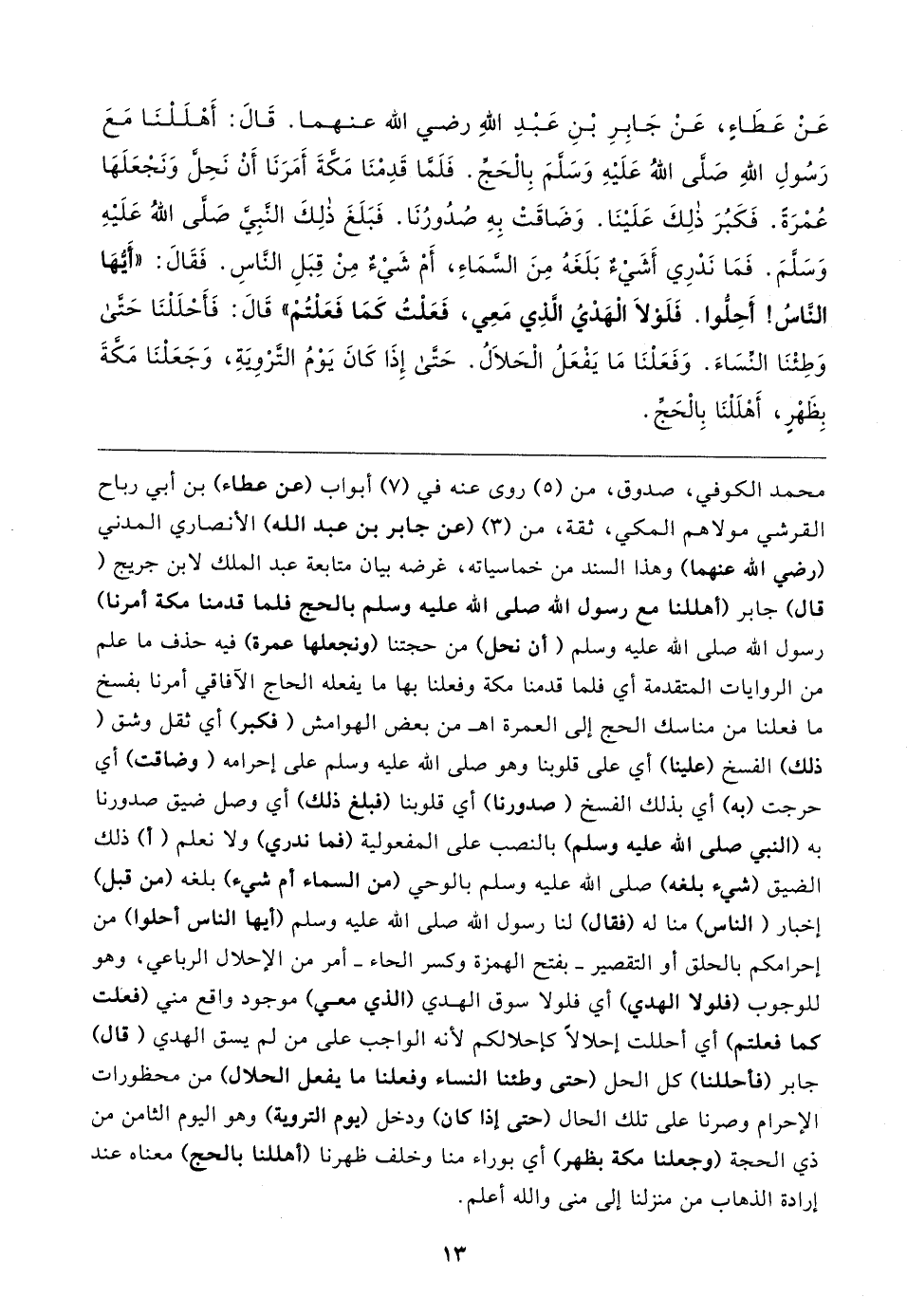 عَنْ عَطَاءٍ، عَنْ جَابِرِ بْنِ عَبْدِ اللهِ رضي الله عنهما. قَال: أَهْلَلْنَا مَعَ رَسُولِ اللهِ صَلَّى اللهُ عَلَيهِ وَسَلَّمَ بِالْحَجِّ. فَلَمَّا قَدِمْنَا مَكَّةَ أَمَرَنَا أَنْ نَحِلَّ وَنَجْعَلَهَا عُمْرَةٌ. فَكَبُرَ ذلِكَ عَلَينَا. وَضَاقَتْ بِهِ صُدُورُنَا. فَبَلَغَ ذلِكَ النَّبِيَّ صَلَّى اللهُ عَلَيهِ وَسَلَّمَ. فَمَا نَدْرِي أَشَيءٌ بَلَغَهُ مِنَ السَّمَاءِ، أَمْ شَيءٌ مِنْ قِبَلِ النَّاسِ. فَقَال: "أَيُّهَا النَّاسُ! أَحِلُّوا. فَلَوْلا الْهَدْيُ الَّذِي مَعِي، فَعَلْتُ كلمَا فَعَلْتُمْ" قَال: فَأَحْلَلْنَا حَتَّى وَطِئْنَا النِّسَاءَ. وَفَعَلْنَا مَا يَفْعَلُ الْحَلالُ. حَتَّى إِذَا كَانَ يَوْمُ التَّرْويةِ، وَجَعَلْنَا مَكَّةَ بِظَهْرٍ، أَهْلَلْنَا بِالْحَجِّ