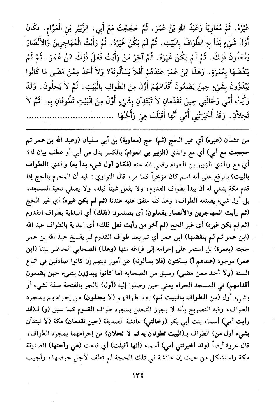 غَيرُهُ. ثُمَّ مُعَاويةُ وَعَندُ اللهِ بن عُمَرَ. ثُمَّ حَجَجْتُ مَعَ أَبِي، الزُّبَيرِ بْنِ الْعَوَّامِ. فَكَانَ أَوَّلَ شَيءٍ بَدَأَ بِهِ الطَّوَافُ بِالْبَيتِ. ثُمَّ لَمْ يَكُنْ غَيرُهُ. ثُمَّ رَأَيتُ المُهَاجِرِينَ وَالأَنْصَارَ يَفْعَلُونَ ذلِكَ. ثُمَّ لَم يَكُنْ غَيرُهُ. ثُمَّ آخِرُ مَنْ رَأَيتُ فَعَلَ ذلِكَ ابْنُ عُمَرَ. ثُمَّ لَمْ يَنْقُضْهَا بِعُمْرةٍ. وَهذَا ابْنُ عُمَرَ عِنْدَهُمْ أَفَلا يَسْأَلُونَهُ؟ وَلَا أَحدٌ مِمَّنْ مَضَى مَا كَانُوا يَبْدَؤُونَ بِشَيءٍ حِينَ يَضَعُونَ أَقْدَامَهُمْ أَوَّلَ مِنَ الطَّوافِ بِالْبَيتِ. ثُمَّ لَا يَحلُّونَ. وَقَدْ رَأَيتُ أُمِّي وَخَالتِي حِينَ تَقْدَمَانِ لَا تَبْتَدآنِ بِشَيءٍ أوَّلَ مِنَ الْبَيتِ تَطُوفَانِ بِهِ. ثُمَّ لَا تَحِلَّانِ. وَقَدْ أَخبَرَتْنِي أُمِّي أَنَّهَا أَقْبَلَتْ هِيَ وَأُخْتُهَا