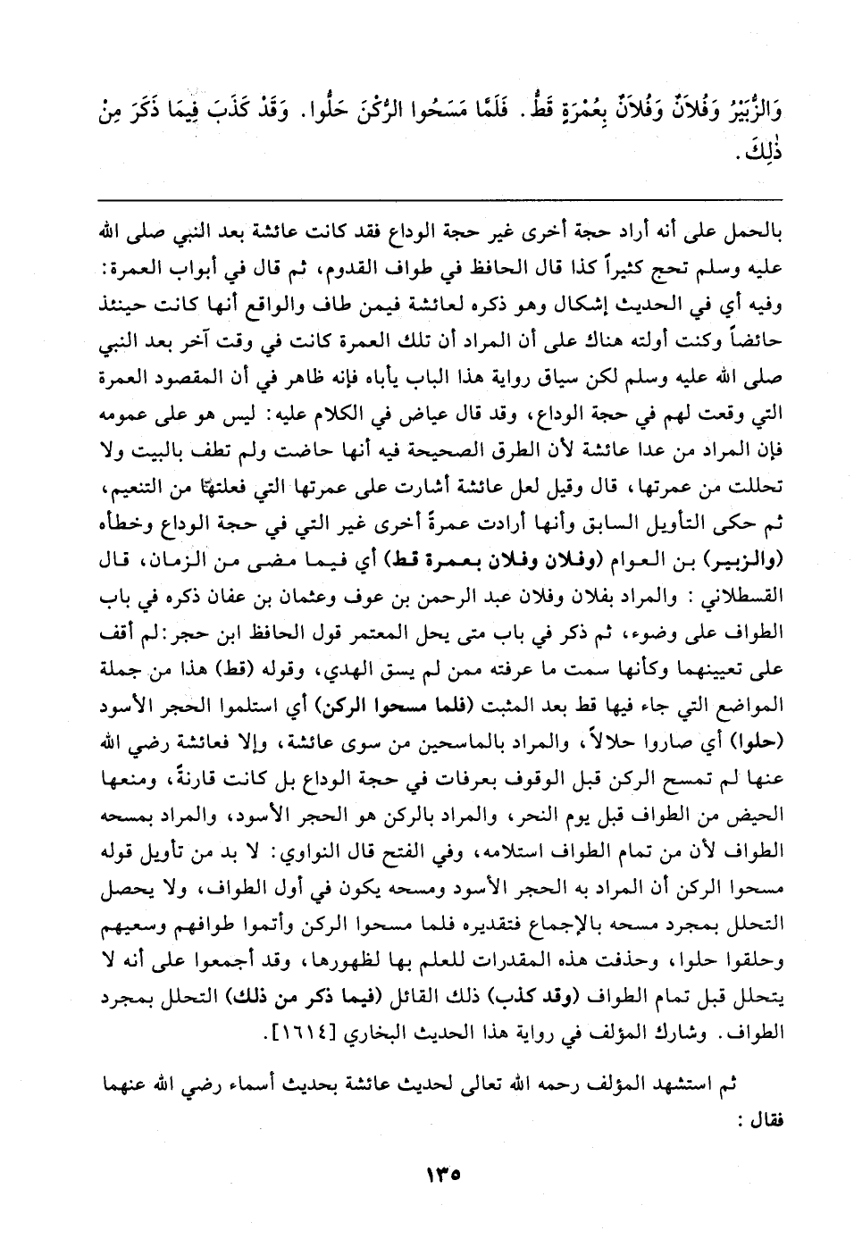 بالحمل على أنه أراد حجة أخرى غير حجة الوداع فقد كانت عائشة بعد النبي صلى الله عليه وسلم تحج كثيرًا كذا قال الحافظ في طواف القدوم، ثم قال في أبواب العمرة: وفيه أي في الحديث إشكال وهو ذكره لعائشة فيمن طاف والواقع أنها كانت حينئذ حائضًا وكنت أولته هناك على أن المراد أن تلك العمرة كانت في وقت آخر بعد النبي صلى الله عليه وسلم لكن سياق رواية هذا الباب يأباه فإنه ظاهر في أن المقصود العمرة التي وقعت لهم في حجة الوداع، وقد قال عياض في الكلام عليه: ليس هو على عمومه فإن المراد من عدا عائشة لأن الطرق الصحيحة فيه أنها حاضت ولم تطف بالبيت ولا تحللت من عمرتها، قال وقيل لعل عائشة أشارت على عمرتها التي فعلتها من التنعيم، ثم حكى التأويل السابق وأنها أرادت عمرةَ أخرى غير التي في حجة الوداع وخطأه (والزبير) بن العوام (وفلان وفلان بعمرة قط) أي فيما مضى من الزمان، قال القسطلاني: والمراد بفلان وفلان عبد الرحمن بن عوف وعثمان بن عفان ذكره في باب الطواف على وضوء، ثم ذكر في باب متى يحل المعتمر قول الحافظ ابن حجر: لم أقف على تعيينهما وكأنها سمت ما عرفته ممن لم يسق الهدي، وقوله (قط) هذا من جملة المواضع التي جاء فيها قط بعد المثبت (فلما مسحوا الركن) أي استلموا الحجر الأسود (حلوا) أي صاروا حلالًا، والمراد بالماسحين من سوى عائشة، وإلا فعائشة رضي الله عنها لم تمسح الركن قبل الوقوف بعرفات في حجة الوداع بل كانت قارنةً، ومنعها الحيض من الطواف قبل يوم النحر، والمراد بالركن هو الحجر الأسود، والمراد بمسحه الطواف لأن من تمام الطواف استلامه، وفي الفتح قال النواوي: لا بد من تأويل قوله مسحوا الركن أن المراد به الحجر الأسود ومسحه يكون في أول الطواف، ولا يحصل التحلل بمجرد مسحه بالإجماع فتقديره فلما مسحوا الركن وأتموا طوافهم وسعيهم وحلقوا حلوا، وحذفت هذه المقدرات للعلم بها لظهورها، وقد أجمعوا على أنه لا يتحلل قبل تمام الطواف (وقد كذب) ذلك القائل (فيما ذكر من ذلك) التحلل بمجرد الطواف. وشارك المؤلف في رواية هذا الحديث البخاري [١٦١٤].