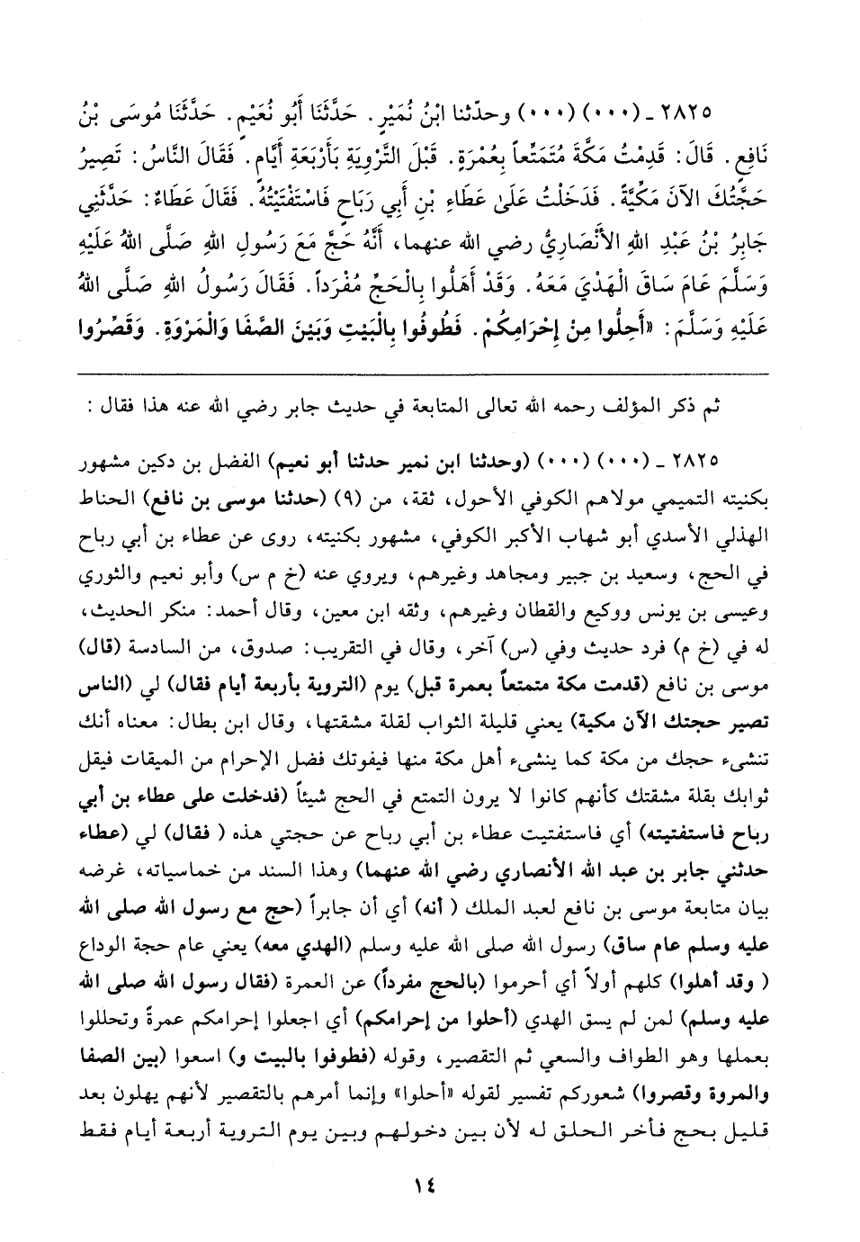 ثم ذكر المؤلف رحمه الله تعالى المتابعة في حديث جابر رضي الله عنه هذا فقال: ٢٨٢٥ - (٠٠) (٠٠) (وحدثنا ابن نمير حدثنا أبو نعيم) الفضل بن دكين مشهور بكنيته التميمي مولاهم الكوفي الأحول، ثقة، من (٩) (حدثنا موسى بن نافع) الحناط الهذلي الأسدي أبو شهاب الأكبر الكوفي، مشهور بكنيته، روى عن عطاء بن أبي رباح في الحج، وسعيد بن جبير ومجاهد وغيرهم، ويروي عنه (خ م س) وأبو نعيم والثوري وعيسى بن يونس ووكيع والقطان وغيرهم، وثقه ابن معين، وقال أحمد: منكر الحديث، له في (خ م) فرد حديث وفي (س) آخر، وقال في التقريب: صدوق، من السادسة (قال) موسى بن نافع (قدمت مكة متمتعًا بعمرة قبل) يوم (التروية بأربعة أيام فقال) لي (الناس تصير حجتك الآن مكية) يعني قليلة الثواب لقلة مشقتها، وقال ابن بطال: معناه أنك تنشئ حجك من مكة كما ينشئ أهل مكة منها فيفوتك فضل الإحرام من الميقات فيقل ثوابك بقلة مشقتك كأنهم كانوا لا يرون التمتع في الحج شيئًا (فدخلت على عطاء بن أبي رباح فاستفتيته) أي فاستفتيت عطاء بن أبي رباح عن حجتي هذه (فقال) لي (عطاء حدثني جابر بن عبد الله الأنصاري رضي الله عنهما) وهذا السند من خماسياته، غرضه بيان متابعة موسى بن نافع لعبد الملك (أنه) أي أن جابرًا (حج مع رسول الله صلى الله عليه وسلم عام ساق) رسول الله صلى الله عليه وسلم (الهدي معه) يعني عام حجة الوداع (وقد أهلوا) كلهم أولًا أي أحرموا (بالحج مفردًا) عن العمرة (فقال رسول الله صلى الله عليه وسلم) لمن لم يسق الهدي (أحلوا من إحرامكم) أي اجعلوا إحرامكم عمرة وتحللوا بعملها وهو الطواف والسعي ثم التقصير، وقوله (فطوفوا بالبيت و) اسعوا (بين الصفا والمروة وقصروا) شعوركم تفسير لقوله "أحلوا" وإنما أمرهم بالتقصير لأنهم يهلون بعد قليل بحج فأخر الحلق له لأن بين دخولهم وبين يوم التروية أربعة أيام فقط